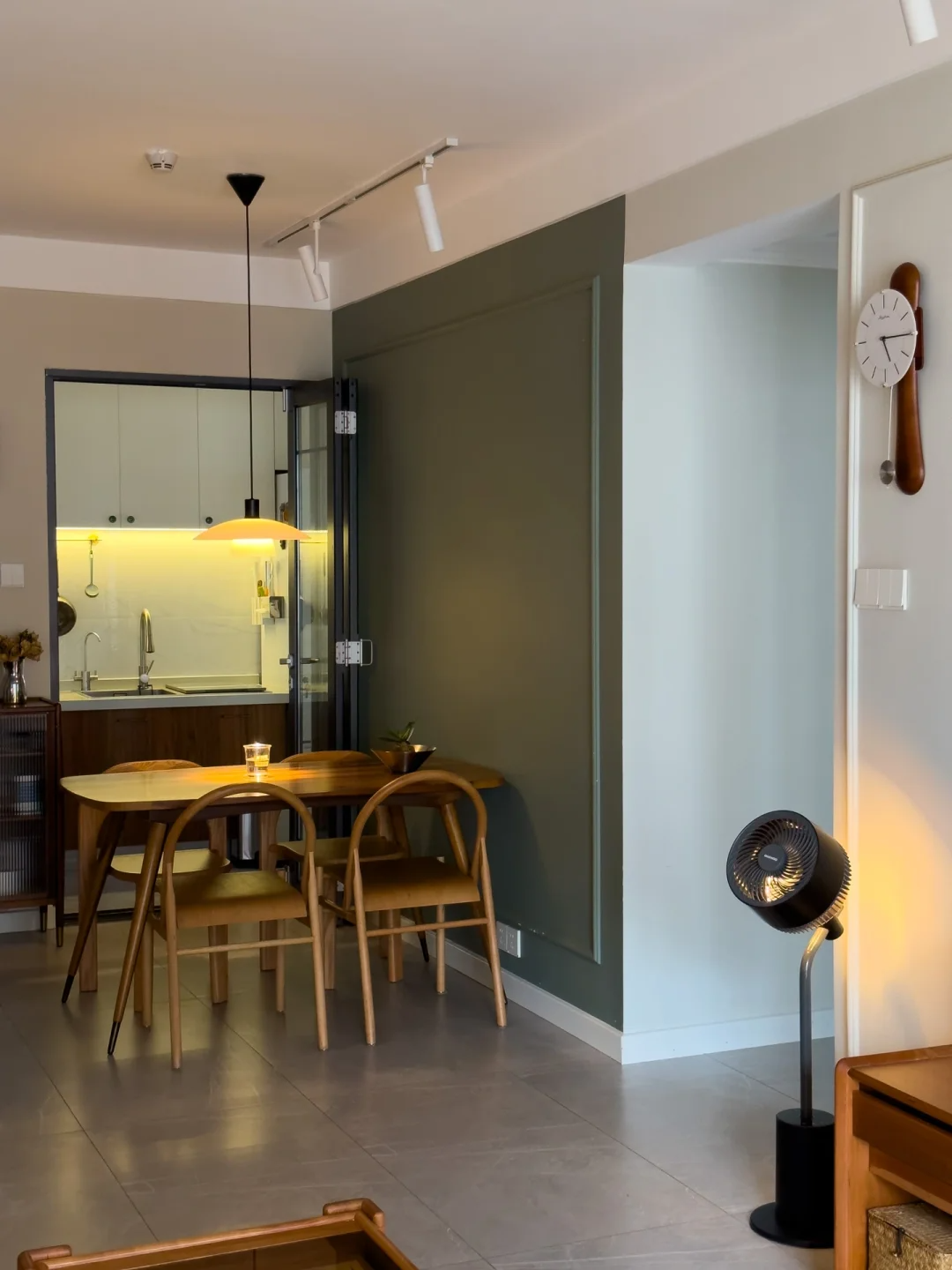 餐厅的一面墙刷上了复古绿色,视觉上区分了功能区。茶几上方的斗胆灯也能提供足够的亮度,保证了用餐和聚会时的光线需求。