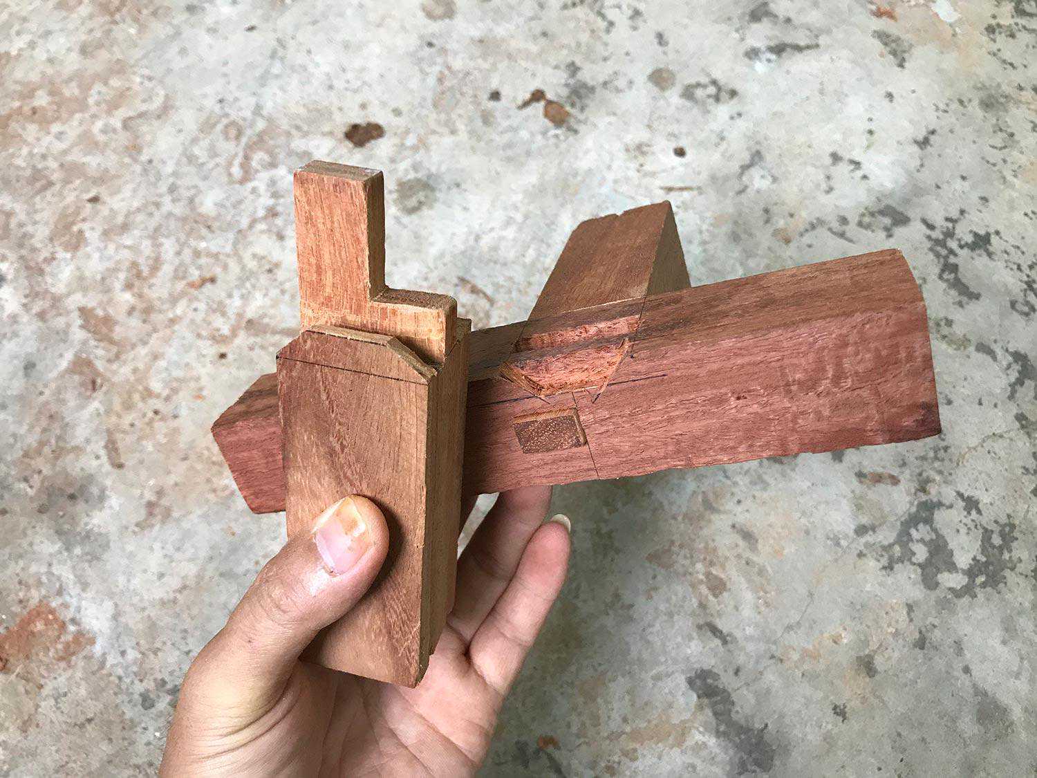榫头的肩是弧形的,肩的弧度大小和相交圆材的接触面弧度一致。