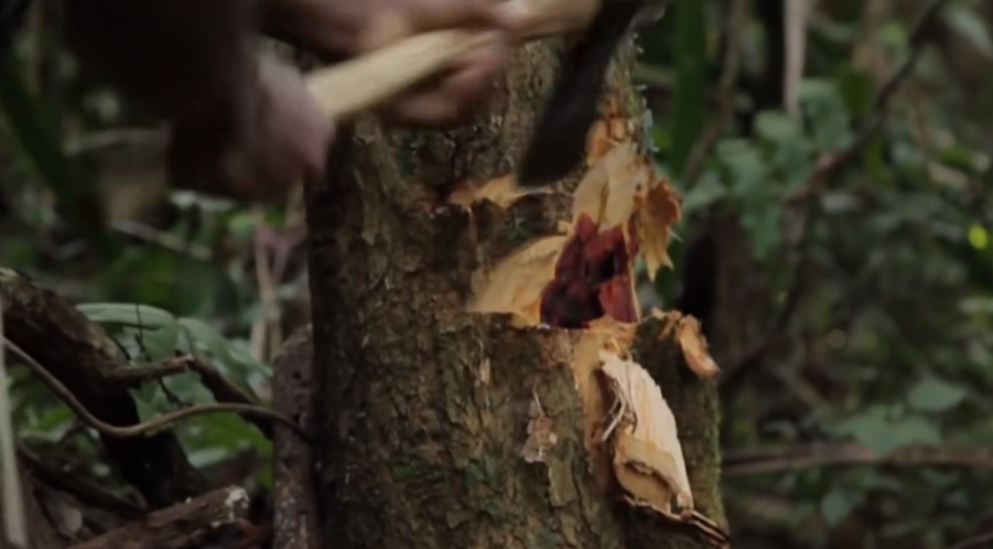 手下们开始疯狂劈砍这棵红木,美丽的玫瑰色木心逐渐露了出来。
