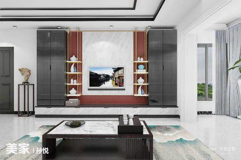 整体布局以居中方正对称为主,电视背景墙大胆采用故宫的宫墙锦红附着金属质感的边线和高级的大理石质感,提炼出故宫上元之夜的尊贵、奢华和活力。