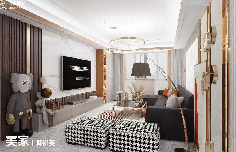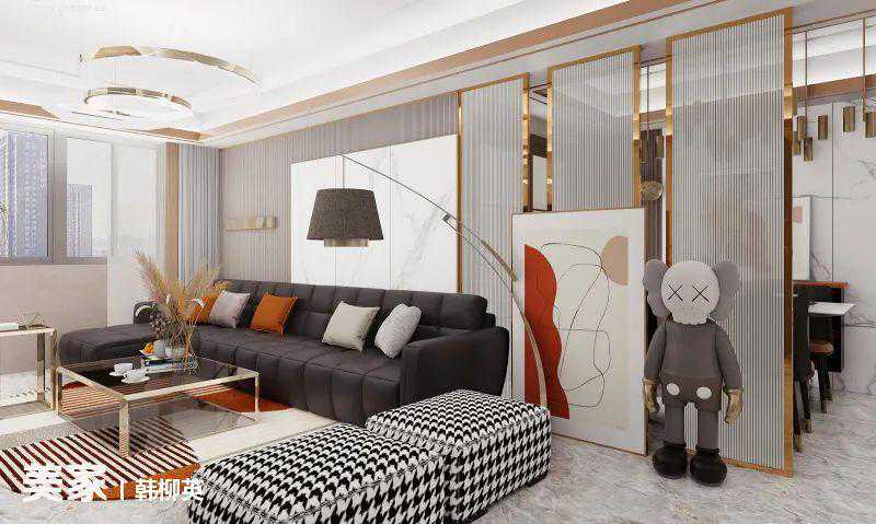 整体采用轻奢风格让空间更宽敞明亮,利用一些装饰性强的元素塑造温暖氛围。客厅极简配色,在各种线条形状的搭配下,显得层次丰富、温和清静。