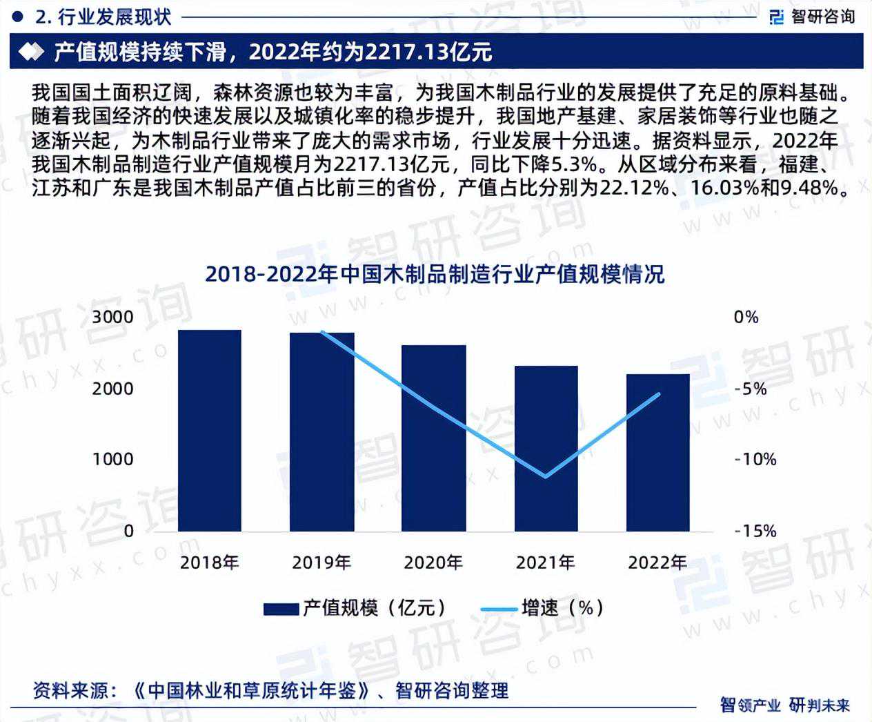 我国国土面积辽阔,森林资源也较为丰富,为我国木制品行业的发展提供了充足的原料基础。随着我国经济的快速发展以及城镇化率的稳步提升,我国地产基建、家居装饰等行业也随之逐渐兴起,为木制品行业带来了庞大的需求市场,行业发展十分迅速。据资料显示,2022年我国木制品制造行业产值规模月为2217.13亿元,同比下降5.3%。从区域分布来看,福建、江苏和广东是我国木制品产值占比前三的省份,产值占比分别为22.12%、16.03%和9.48%。