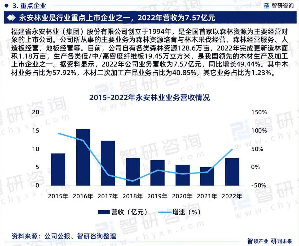 福建省永安林业(集团)股份有限公司创立于1994年,是全国首家以森林资源为主要经营对象的上市公司。公司所从事的主要业务为森林资源培育与林木采伐经营、森林经营服务、人造板经营、地板经营等。目前,公司自有各类森林资源128.6万亩,2022年完成更新造林面积1.18万亩,生产各类低/中/高密度纤维板19.45万立方米,是我国领先的木材生产及加工上市企业之一。据资料显示,2022年公司业务营收为7.57亿元,同比增长49.44%。其中木材业务占比为57.92%,木材二次加工产品业务占比为40.85%,其它业务占比为1.23%。