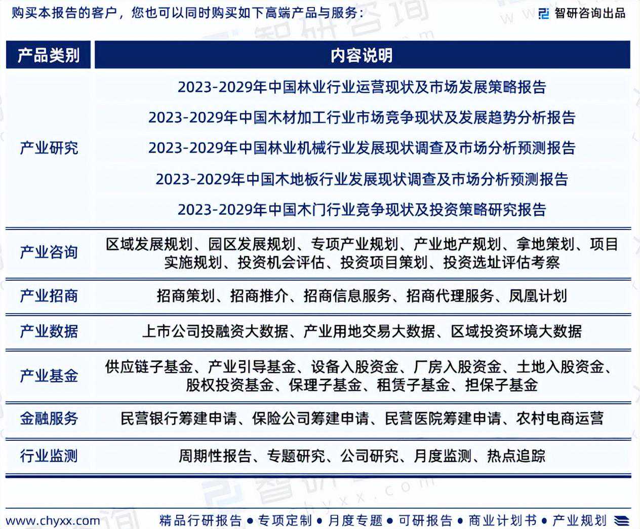 为方便行业人士或投资者更进一步了解木制品行业现状与前景,智研咨询特推出《2023-2029年中国木制品行业市场运营格局及未来前景分析报告》(以下简称《报告》)。报告对中国木制品市场做出全面梳理和深入分析,是智研咨询多年连续追踪、实地走访、调研和分析成果的呈现。