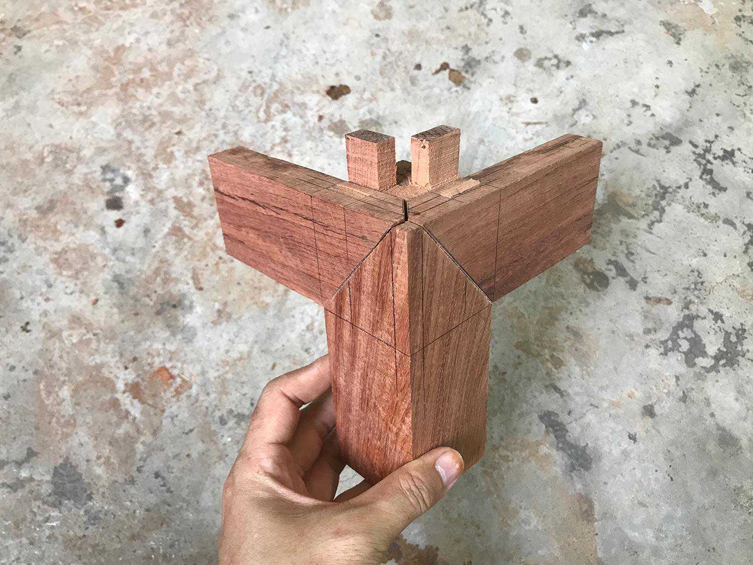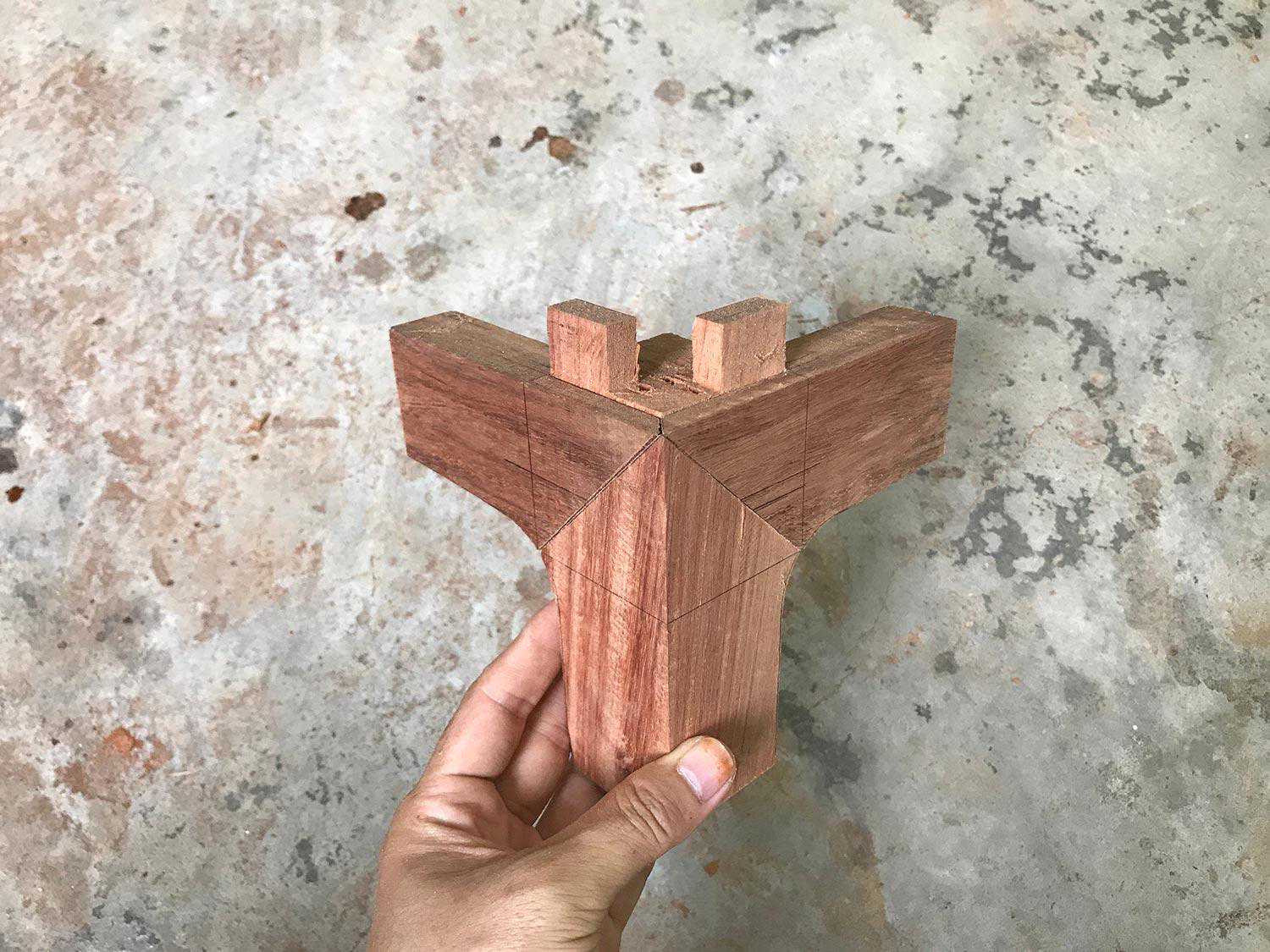 粽角榫因其外形仿佛粽子角而得名。三根料相交的一个结构,任何一个角度都看不到料横截面。