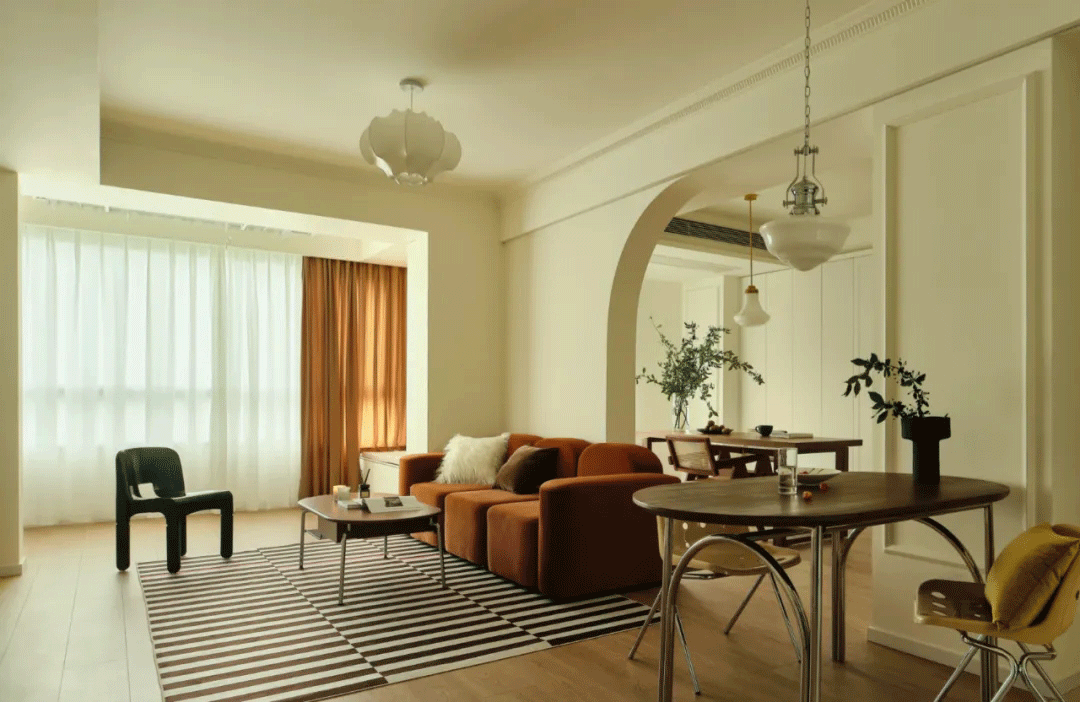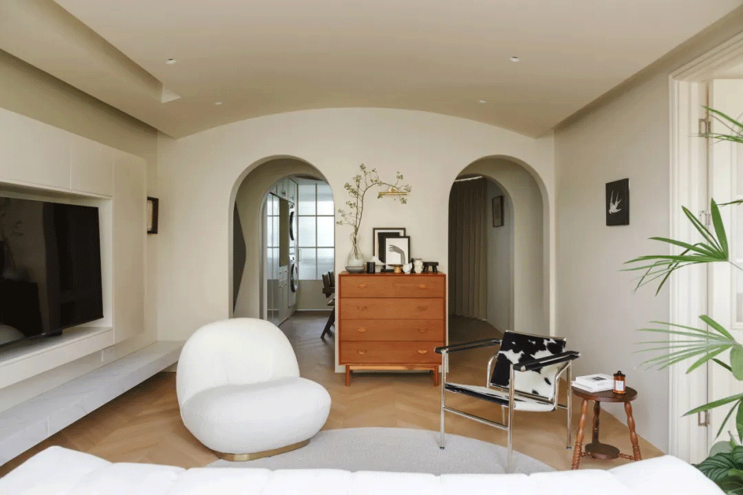 客厅做了对称双拱门设计,充分营造对法式美感生活的想象。对称设计强化了空间的秩序美感,也延长了视觉景深。