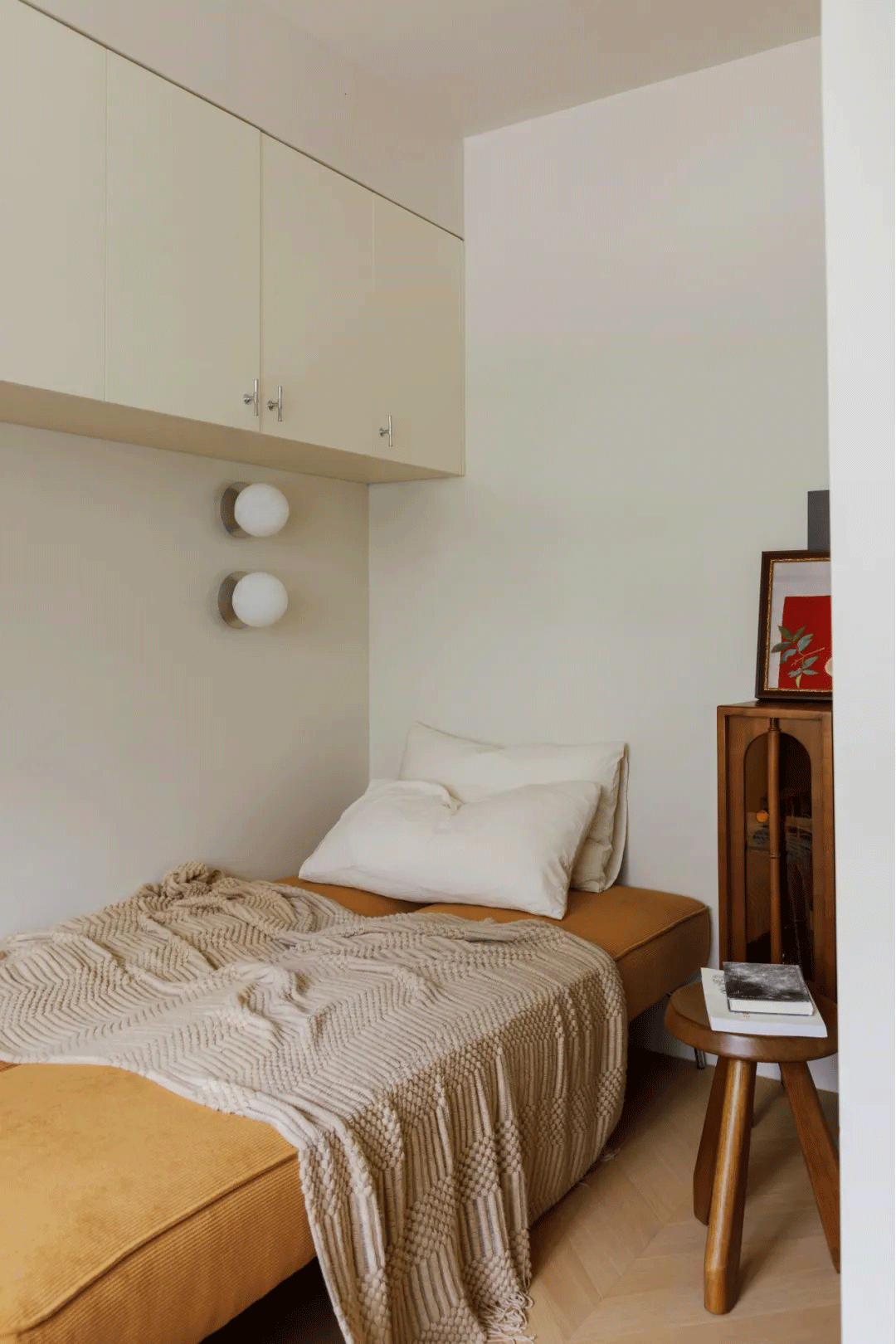 书房通过极简设计,以奶油色点缀大地黄,使整个空间更加轻盈舒适。整面墙的书柜和收纳空间,完全满足了屋主的书籍收纳需求。