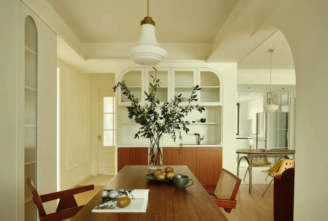 穿过双拱门即来到了餐厅,胡桃木餐桌椅点缀编织元素,使空间充满复古的情调。U型半开放厨房,奶油色搭配新芽色,充满小清新的复古感。
