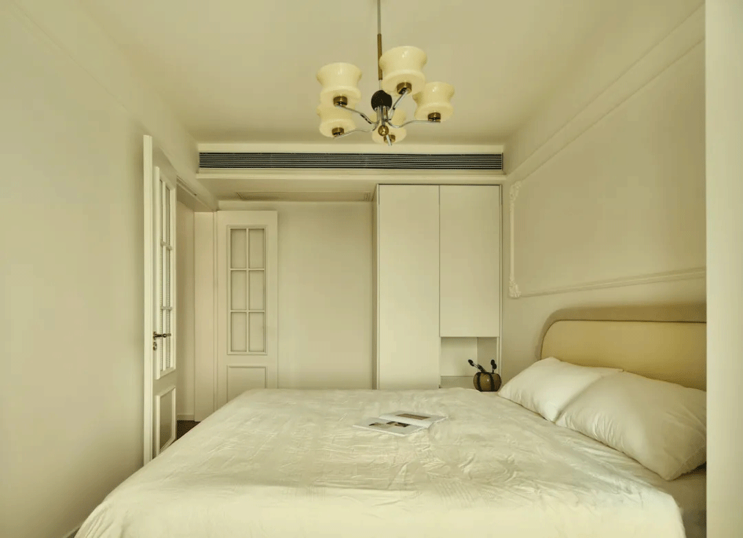 卧室里,精致的墙面石膏雕花、木色的床头、金属的床头桌、玻璃的桌面空间被谱成一首唯美的诗,将传统法式的厚重感摘除,以轻盈的姿态迎接居者。