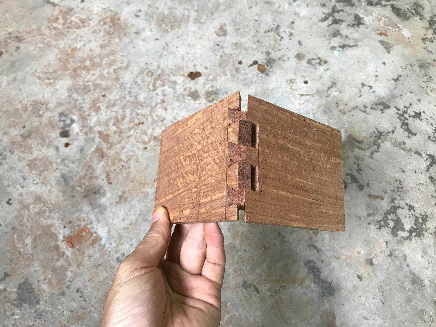 这种方法是平板角接合的最讲究方法,从外表看不到榫头,但不如明燕尾榫牢固。