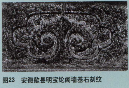 6.明代靠背板上鸡心形开光内所刻卷云纹,也能在明代建筑设施中找到其类似的纹样,如图23安徽歙县明代宝纶阁墙基石上的刻纹。