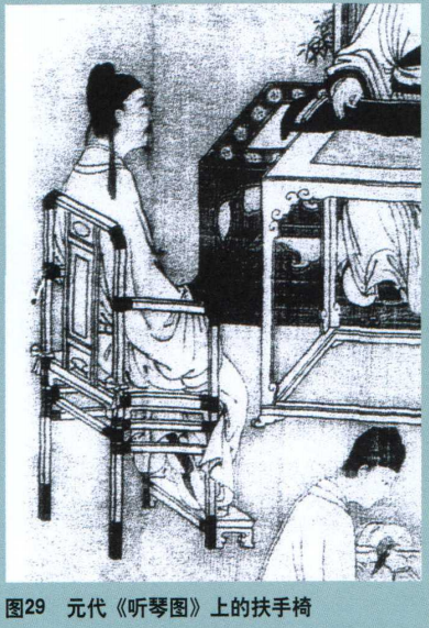 传世的元代作品《听琴图》上绘有一把扶手椅,其靠背板分作三截,上截即作海棠式开光(图29)。