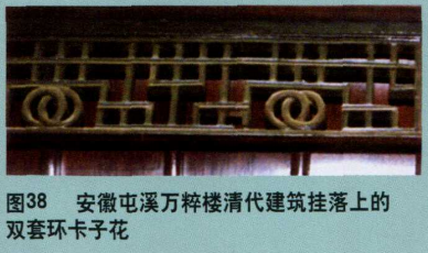 而清代以后,卡子花与矮老的使用则如雨后春笋般发展起来,不但在家具上大量出现(图36、37),双套环卡子花更是清代建筑装饰的常见纹样(图38、39)。