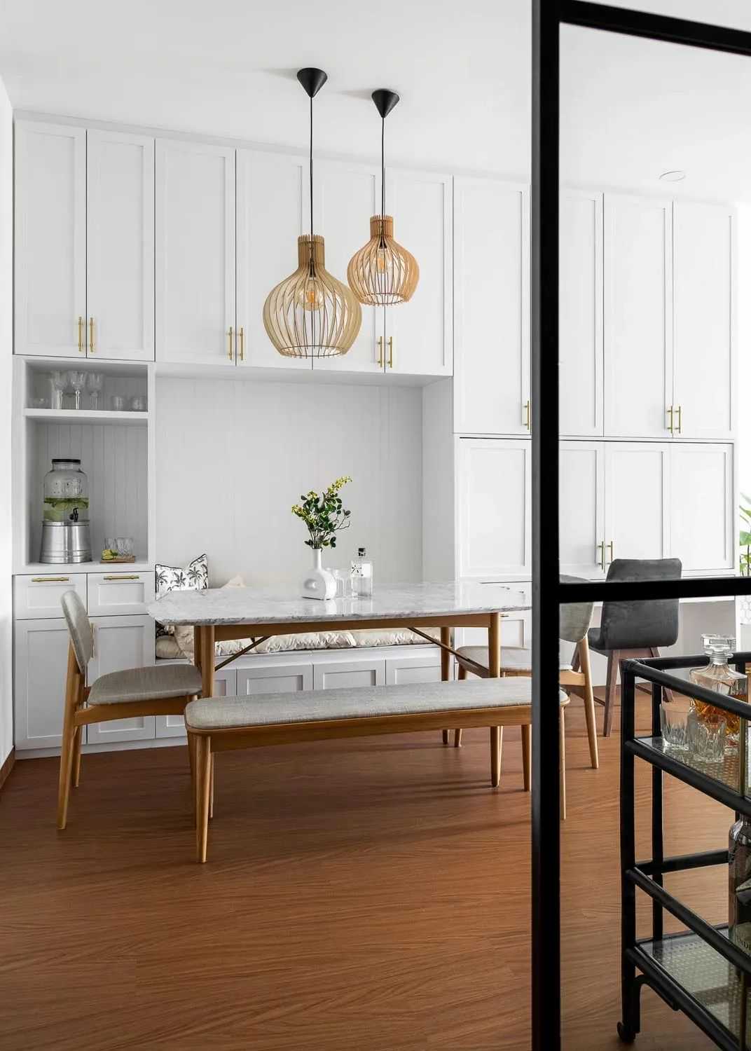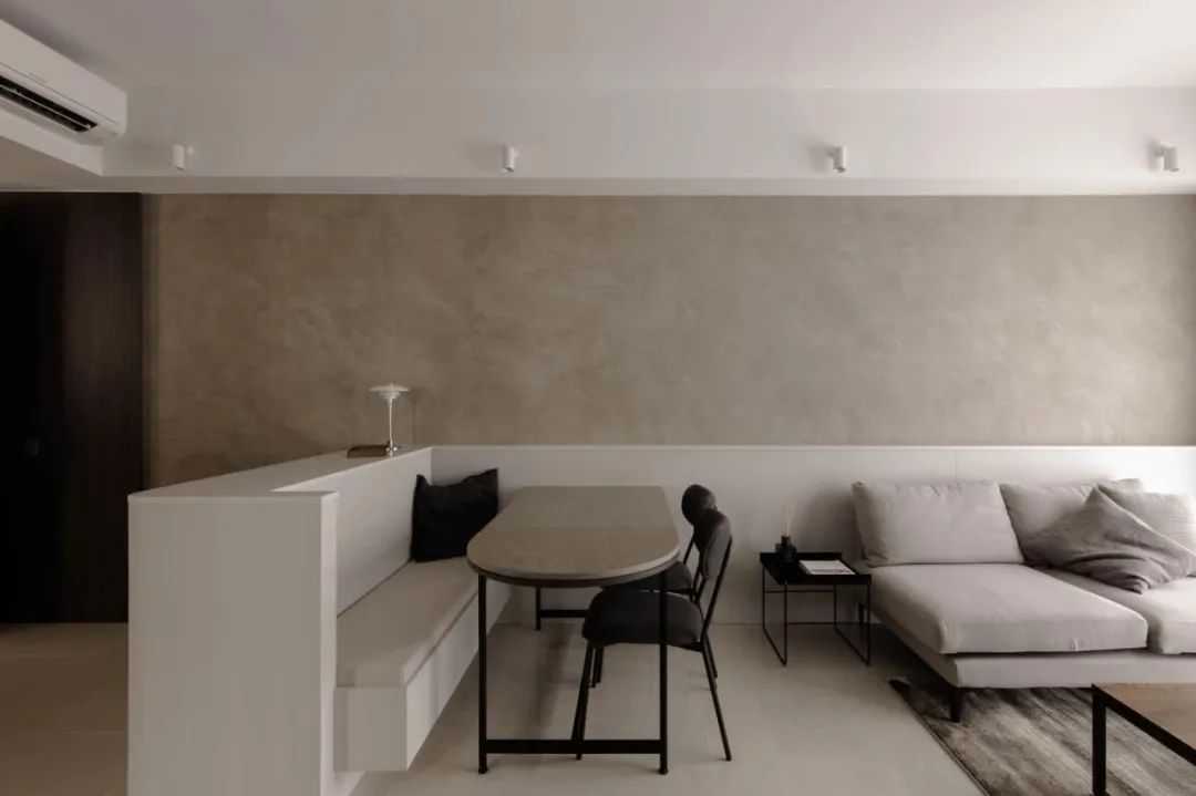 上图的餐长椅由客厅的电视柜延伸而来,最大限度的减少了视觉杂乱,充分利用了空间。