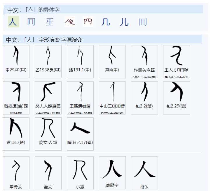 《说文解字》:“人,天地之性最贵者也。此籀文象臂胫之形。”。其甲骨文字形像侧面人行礼之形。犹男子成年行冠礼之形者是籀文(或甲骨文“