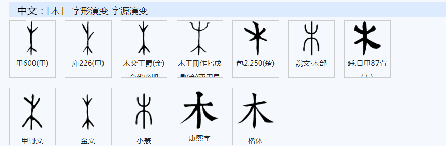 《说文解字》:“木,冒也。冒地而生。东方之行。从屮,下象其根。”。犹冒地而生,其下长根者是木字之范式。