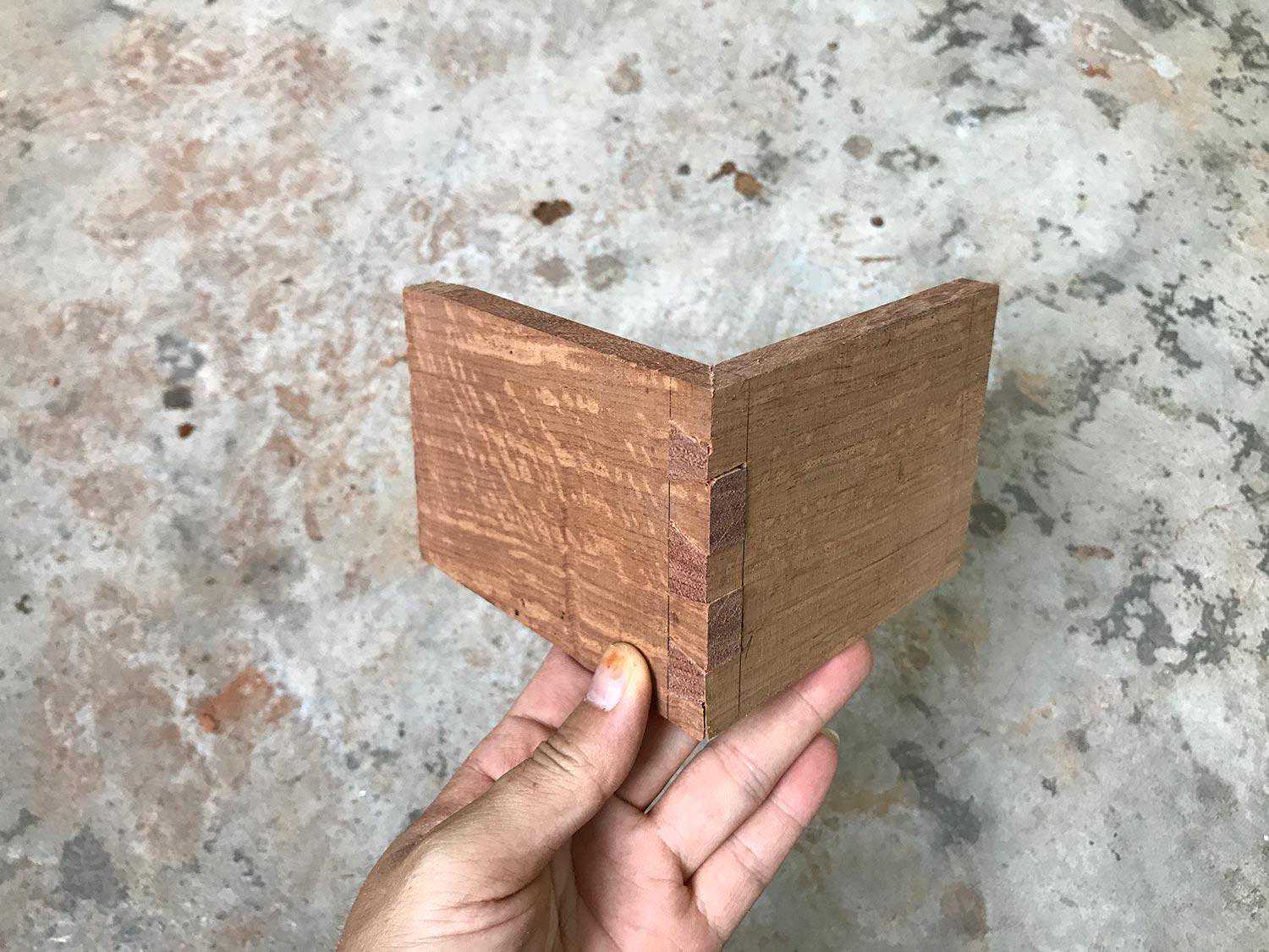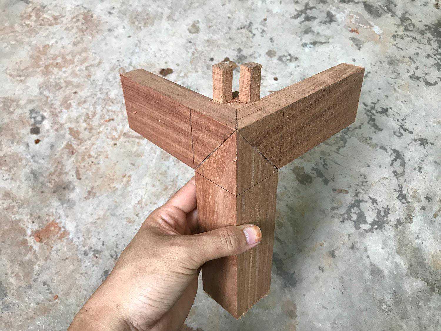 这种方法是平板角接合的最讲究方法,从外表看不到榫头,但不如明燕尾榫牢固。