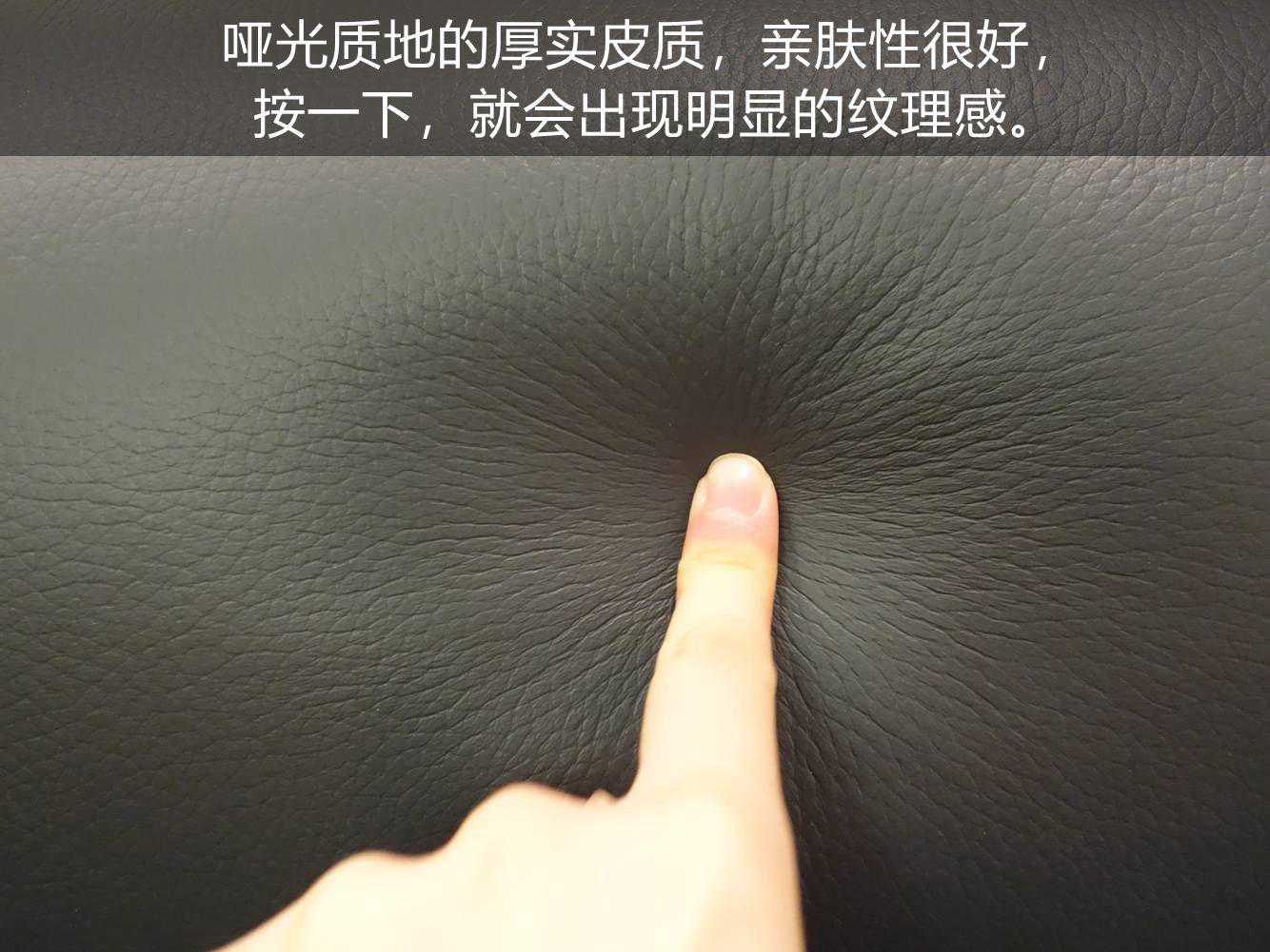 哑光质地的厚实皮质,亲肤性很好。按一下,就会出现明显的纹理感。