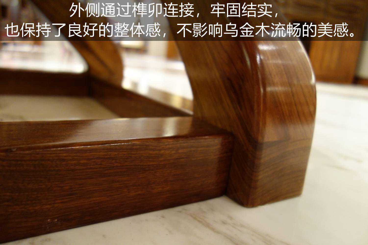 外侧则是通过榫卯连接,牢固结实。外观上,也保持了良好的整体感,不影响乌金木流畅的美感。