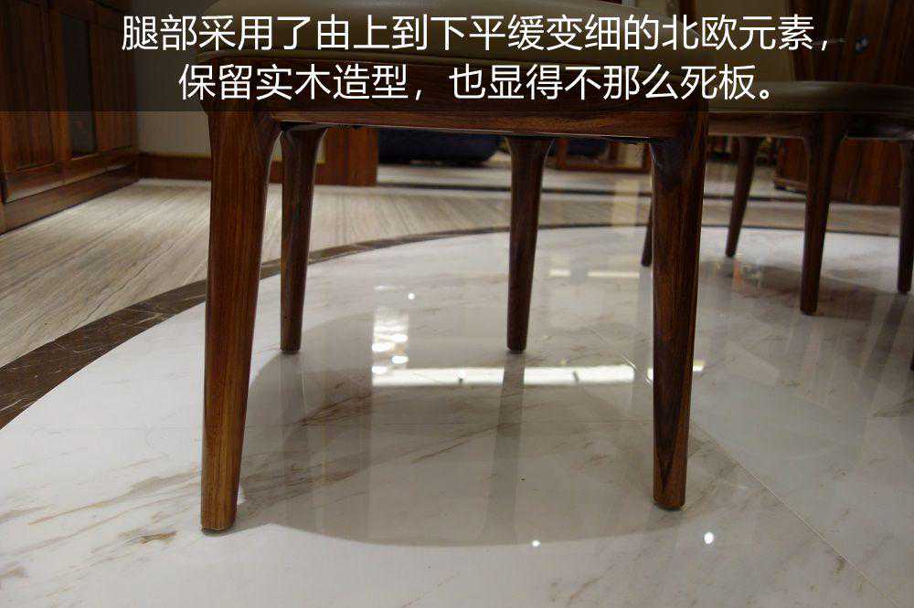 腿部舍弃了常规的四方四正的桌腿,采用了由上到下平缓变细的北欧设计元素。保留实木造型,也显得不那么死板。
