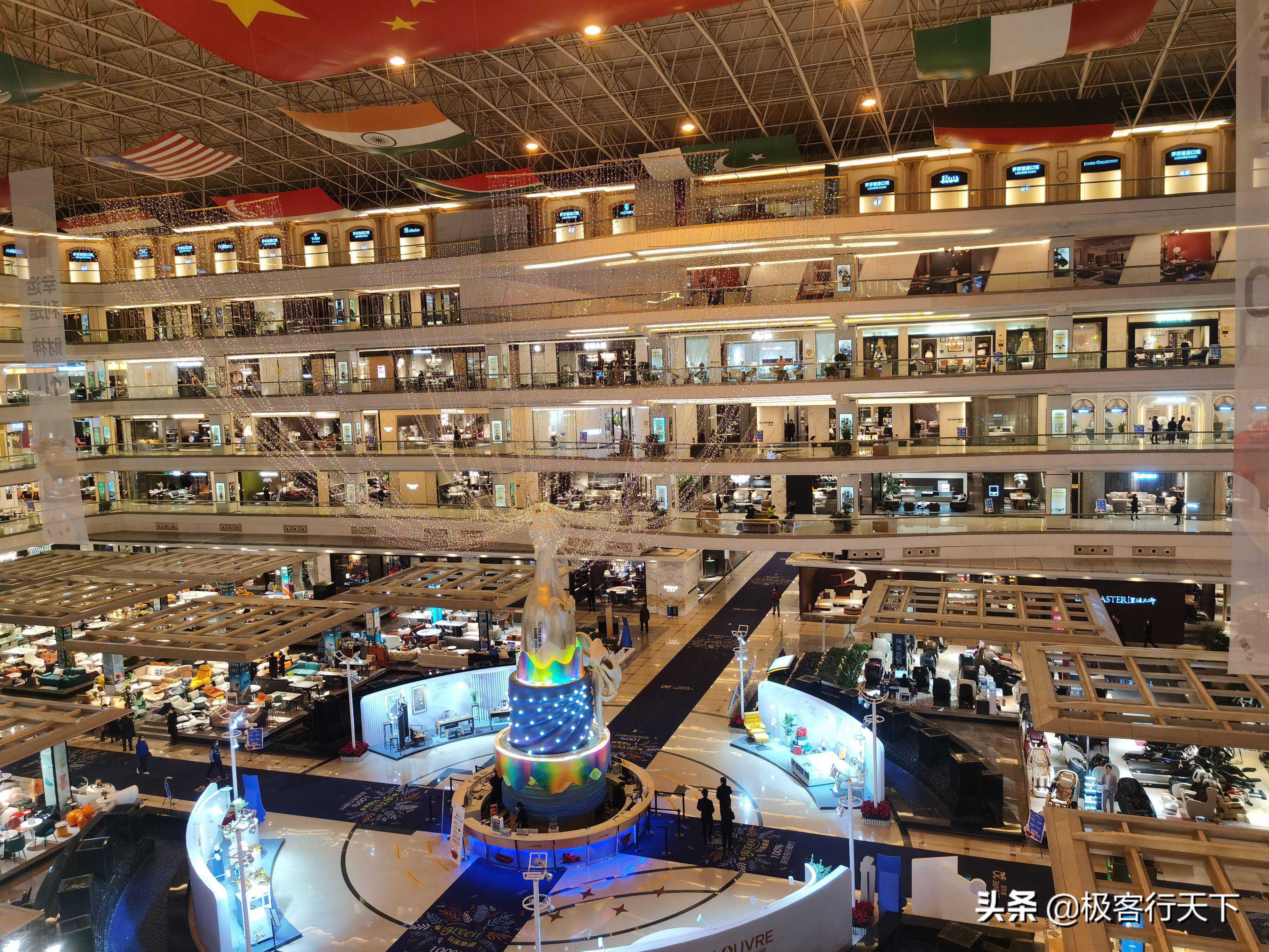 走进这座巨型建筑,如果是第一次过来,确实会被震撼到。这栋大楼共分6层,每一层又分ABCD四个区,一层主要是户外家具和健身器材,中间是中空大厅,所以二层以上可以俯瞰整个商场。二三四层为家居商场,分布着大大小的商家。