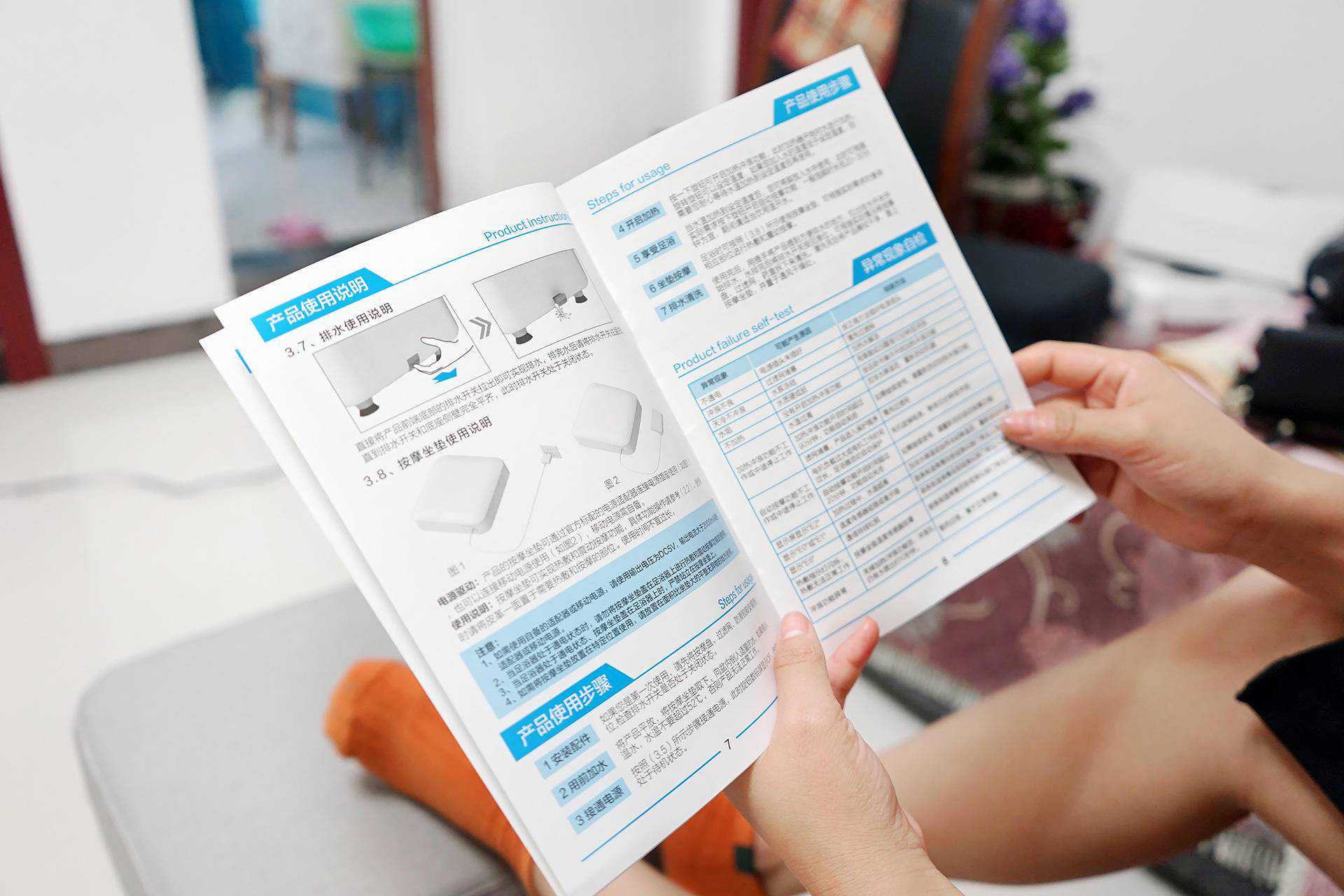 简单开箱,首先我们来看看全家福,这款足浴器除主机外,配件主要包括四个按摩盘、四个防滑脚垫、一个过滤器,另外还有防漏电保护的电源线、按摩坐垫、电源线以及说明书。在使用时,可以翻看下说明书,可以了解下足浴器的功能和注意事项,方便我们快速上手!