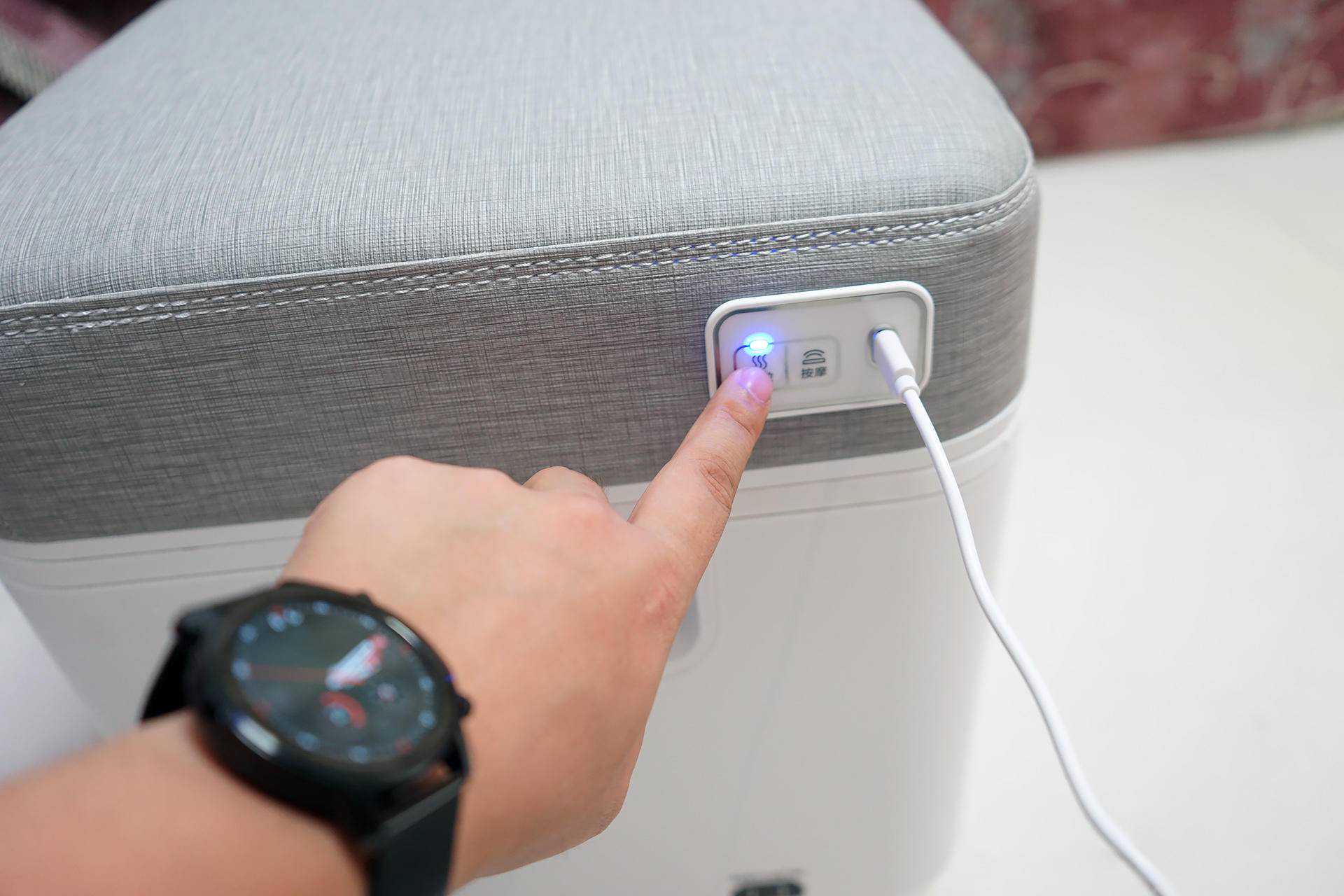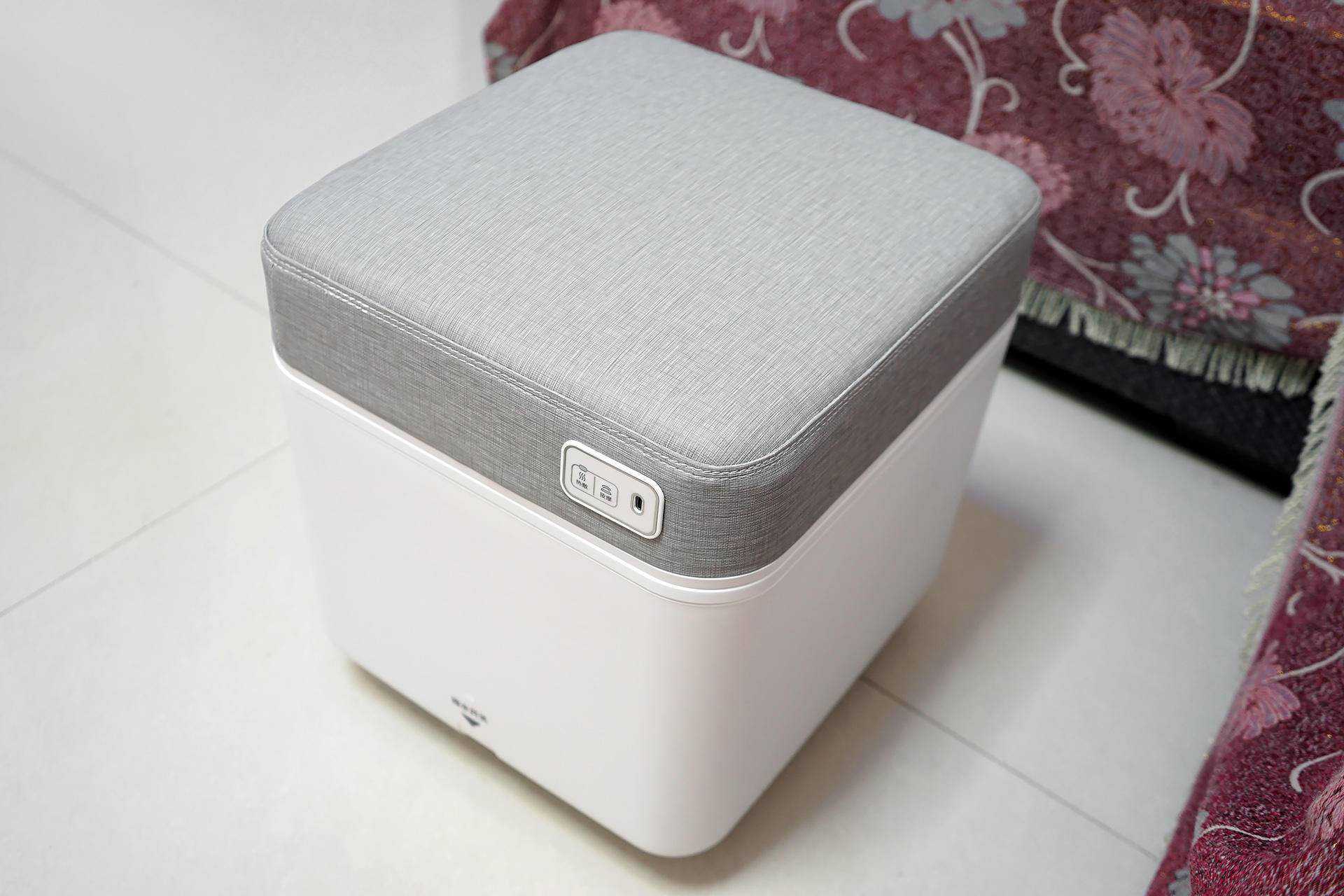 接下来我们来看看足浴器的按摩坐垫,这也是非常棒的一部分!按摩垫采用了经典布纹皮革设计、时尚简约,皮革面料亲肤柔软,摸起来非常柔软。不过,这类材质在夏天当坐垫就有点尴尬,夏天当坐垫会略感闷热,舒适感会下降,所以夏天可以当脚凳,冬天当脚凳和坐垫完美。