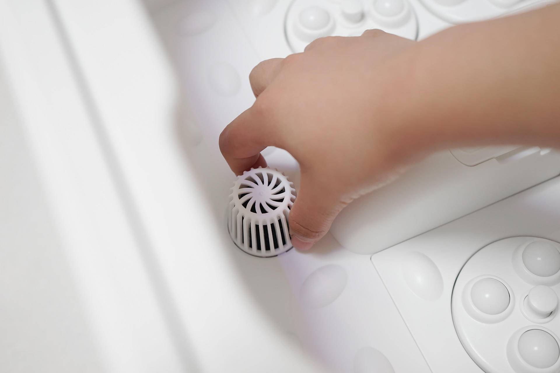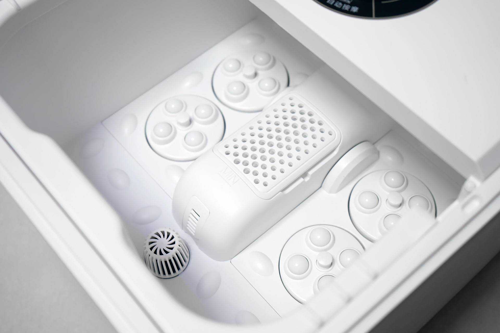 足浴器的中间很多圆孔形状的是药盒区域,拆开后将足浴药包放入药盒槽内即可使用,安装拆卸都非常方便,这样的设计方面我们使用后清洗药盒。两侧是四个按摩盘,一共有16颗自动旋转按摩球,让人体验拟人的按摩感觉,对应足底的穴位和反射区,在使用中有点像泰式揉捏按摩的感觉。此外,在足浴器内部还有一个过滤器,安装和拆卸都非常简单,使用完后拆下过滤器然后清洗过滤棉还可以继续使用。