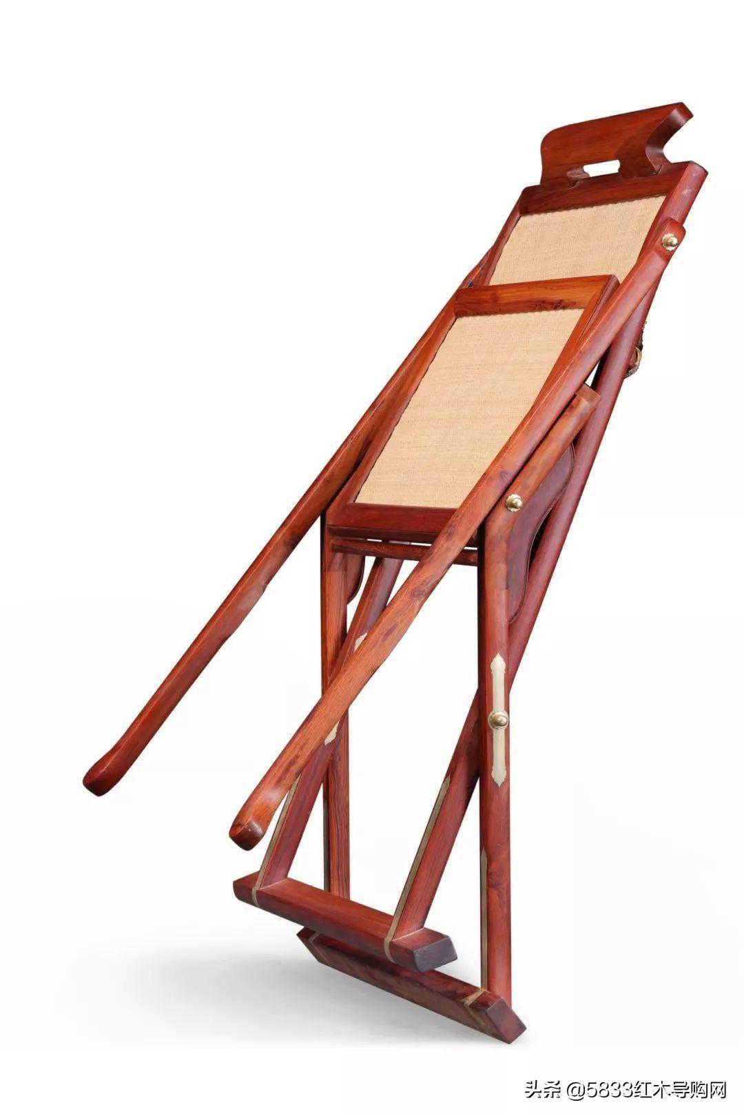 此交椅式躺椅精选白酸枝所制,座椅面与靠背面为手编软屉,此交椅别名春椅。在交椅的接榫处用铜件平镶,不仅美观更起到加固作用。交椅型制搭脑拱起,扶手加长,颇能辅助坐者以最舒适的姿势坐与此椅。造型简洁,凭简练的结构和完美的比例和环境搭配渲染出从容祥和的宁静氛围。整体观之,线条利落大方,设计简洁无冗,竟给人浑然天成之感,比例合度和谐,工艺精湛,便携实用的同时,又独具艺术收藏品特性。