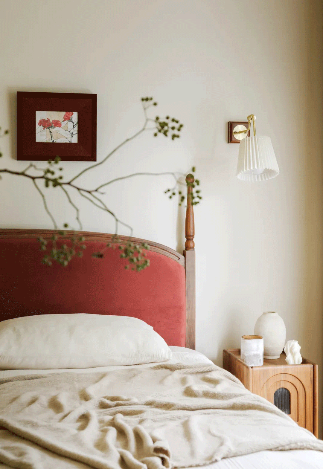 客厅一侧设置法式双开门通往卧室,梅子色的床头、金色丝绒质感窗帘,搭配床头的金色小壁灯,点缀绿植,营造出了复古缱绻的质感和异域风情。