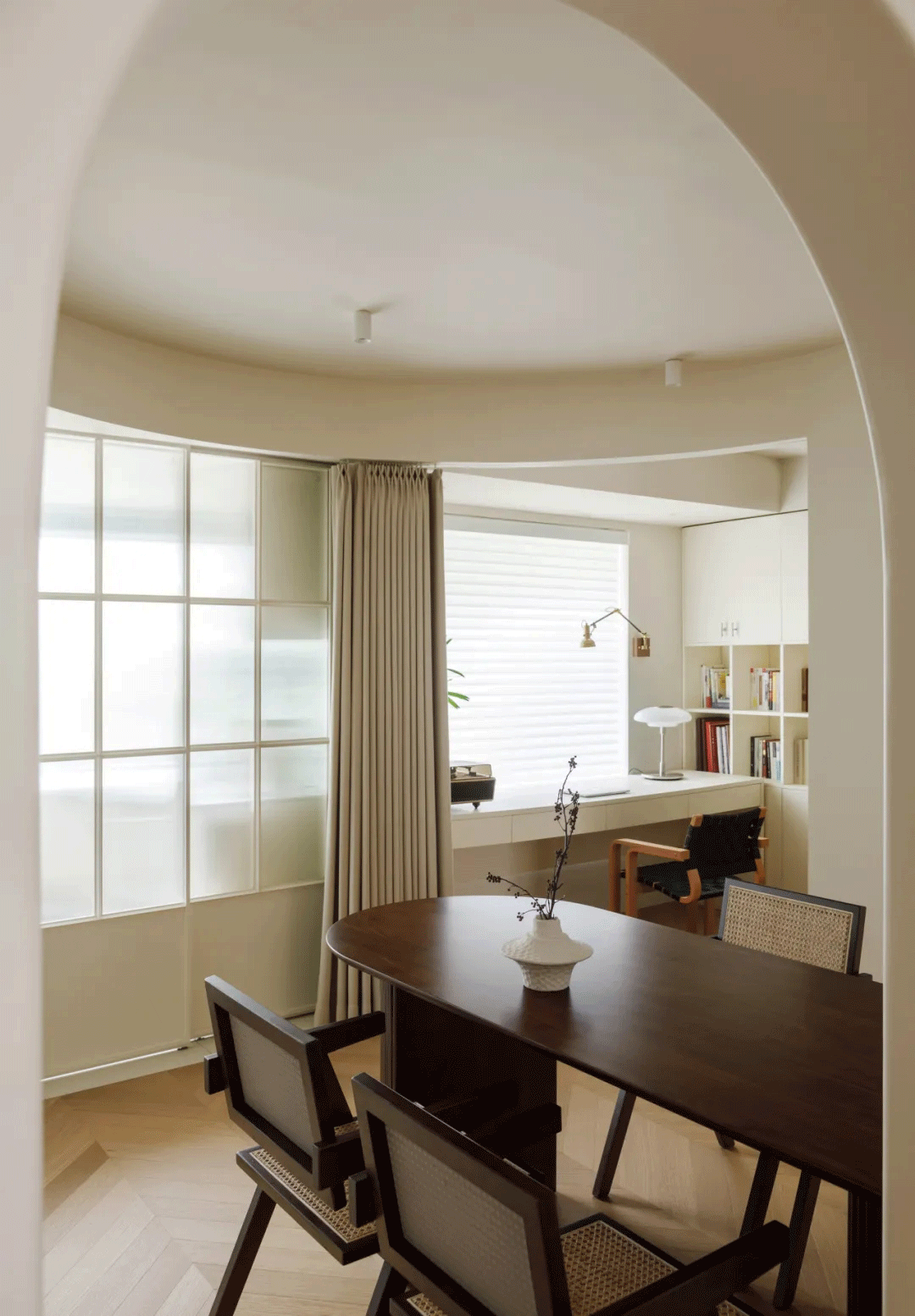 餐厅、厨房、书房三个空间联动,通过落地拉帘、磨砂玻璃推拉门进行分隔,在完整空间内各有边界。半开放设计增加了两个功能空间之间的互动,给家人营造了更多的相处情景的可能性。