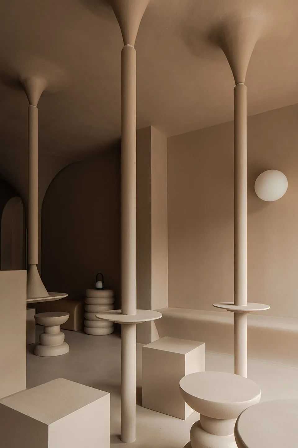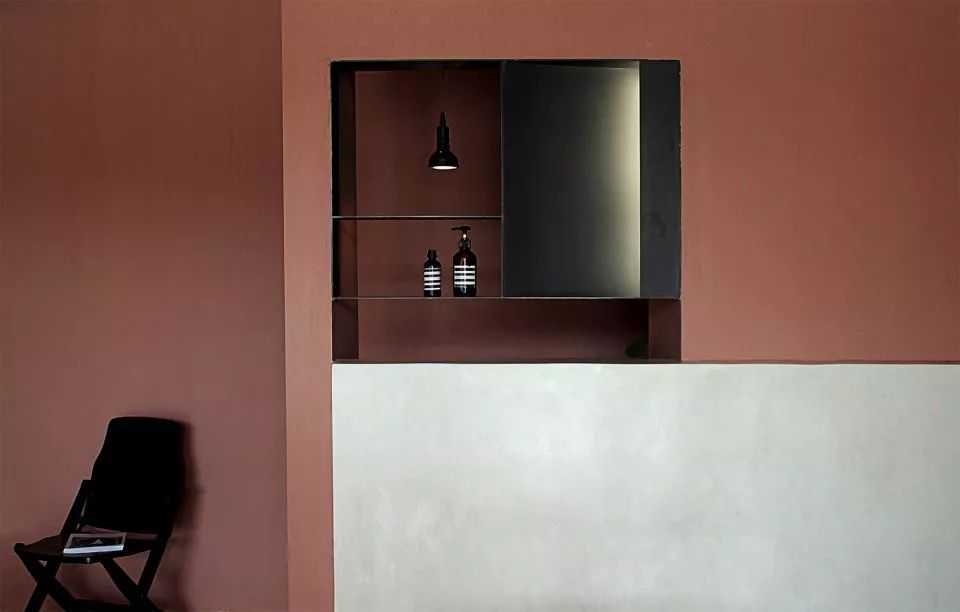 采用深浅不同的同色系突出了奇幻元素,营造出独特的二维效果。咖啡厅前景应用沙色和米色等浅色调,后景应用赤褐色和淡橘色等深色调。锈红色的沙发垫加深了空间的色彩,柜台前沿的金属管极具质感,与其他部分形成对比。