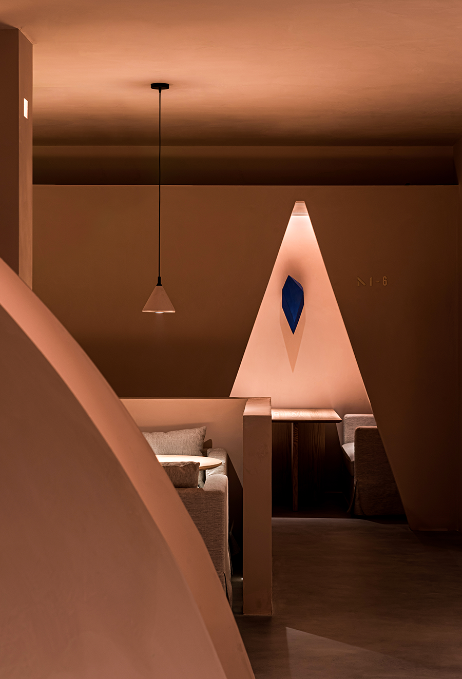 设计师用三角“刺破”天花,所以边界此后去哪,圆被从中割裂,深不见底的红色在蔓延,竟然从眼里渗透到情绪里,这又是什么在作用。