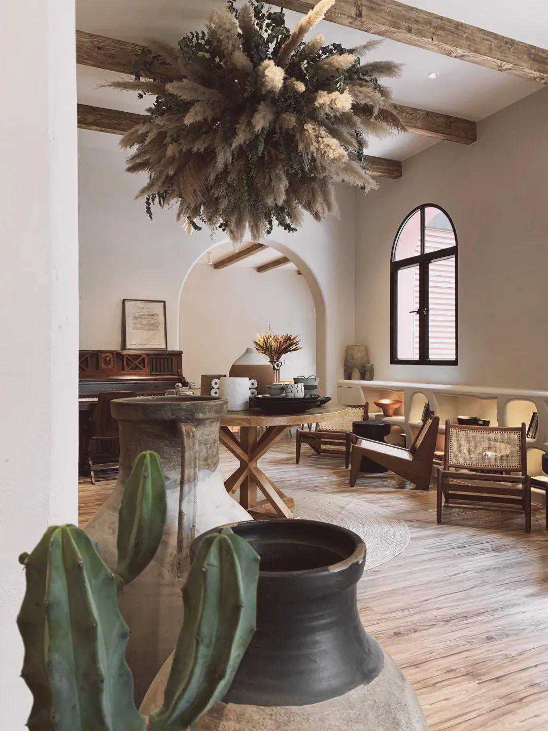 一楼室内空间特别改造了前后两道户型玻璃门,让客人在花园和室内穿梭走动时更多增一些特别的体验,室内分成主厅,次厅及后厨三大块,每个空间均巧妙的用弧形门关做分割,室内墙体选用灰白色粗糙肌理感漆,洞穴结构让所有饰品的呈现显得精致独特,主次厅的天花运用旧船木作横梁点缀,打破原本空间沉闷平淡感,点睛之笔是悬吊在天花上的巨大花艺装置,与下面的复古钢琴和中古旧物形成很好的视觉呼应,座位区除了设计师精心选用的经典藤编瑞克椅,靠墙部分还将户外座位设计特点直接引用到室内,具有趣味性又与户外形成一定的特色关联,整体空间在淡淡的植物草本味道陪衬下体现出浓浓的异域寂静风。