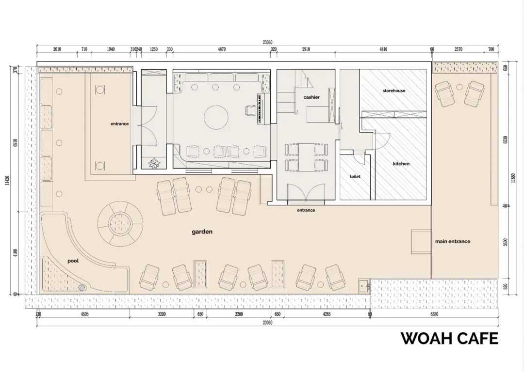 WOAHCAFE位于市中心区一个别墅群里,是一幢4层楼带花园的旧房子,花园的平面占地面积大于楼体,这对于改造整个项目的风格塑造上起了关键作用,与甲方沟通后将其定位为带异域调性,充满热带感的花园cafe。