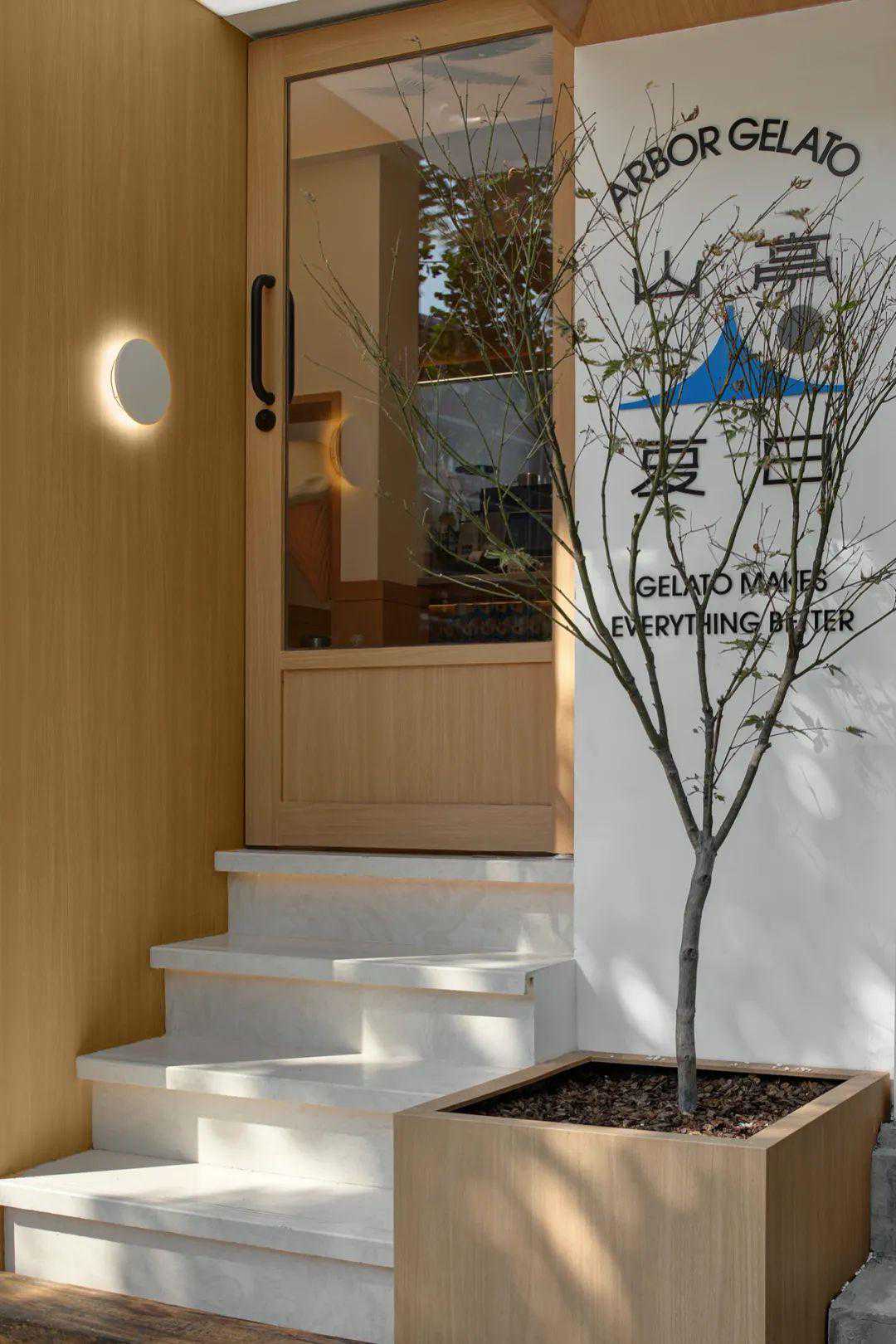 设计从色彩进入,用体块构造表达,辅以灯光氛围,最终落地。入口是一面“L”形的粉色墙体,右下角隐约能看到内部露出的白色结构体,白色的门套结构甚至已经突破粉色的包裹,使进入内部空间这个行为更“理所当然”。远处还能透过左边墙面的窗口看到内部咖啡师的制作,顾客未进门就能感受到氛围。门面亮点是一根横跨整个粉墙的霓虹灯管,傍晚以后有很强的视觉冲击。门前还有一个小院子,白水泥从地面长出来,形成台阶、矮墙、花坛、平台。