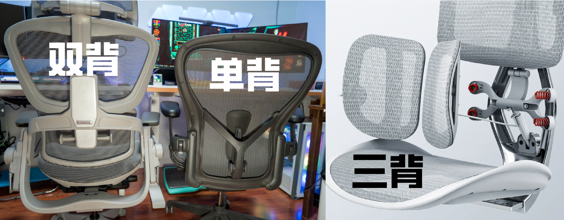椅背从分区说有三类,单背,双背和三背,有的评测说单背不如双背和三背,我认为这是不对的,很多高端椅子都用的单背,单背并不会因为看起来没分区而支撑性不足。