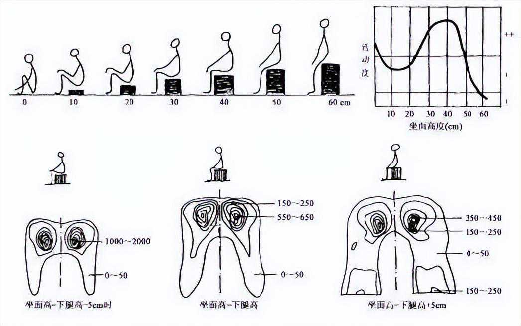 除了椅子的高度,坐垫长度和坐高同样重要,以坐高为例,我们坐姿状态下,坐的太低坐骨节点压力大,时间长了屁股不舒服,坐的太高坐垫前沿压迫大腿,时间长了腿麻。按照网上的说法,坐高在40cm的时候腿部肌肉活动度最高,得不到放松,我认为平坐+脚踏抬高大腿的坐法是最舒服的,也就是下图的30cm高度。