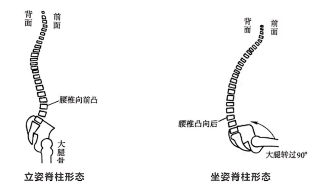 站立和坐下的姿态不同,脊柱的形态也不同,骶尾骨会跟着大腿发生转动。