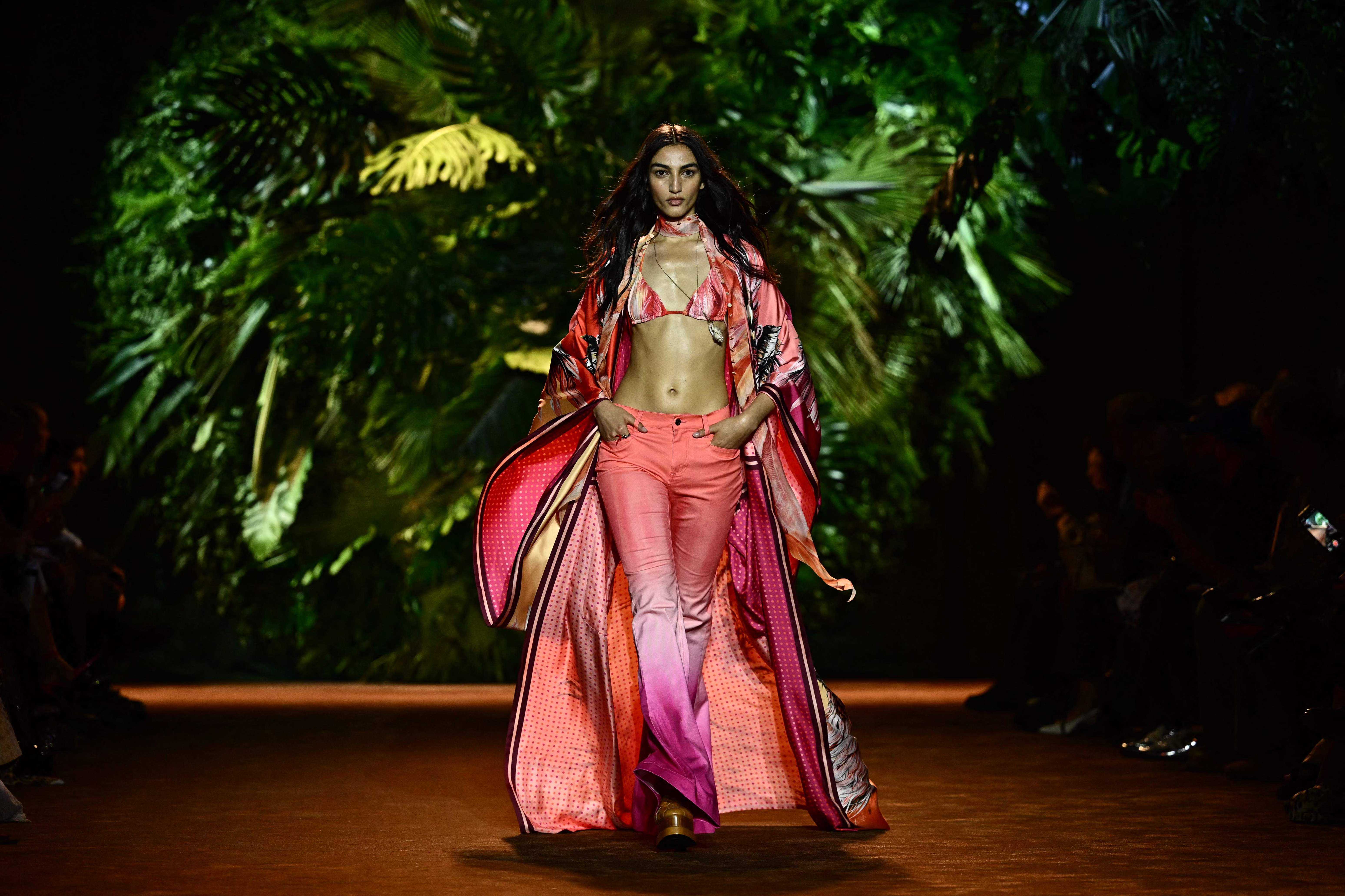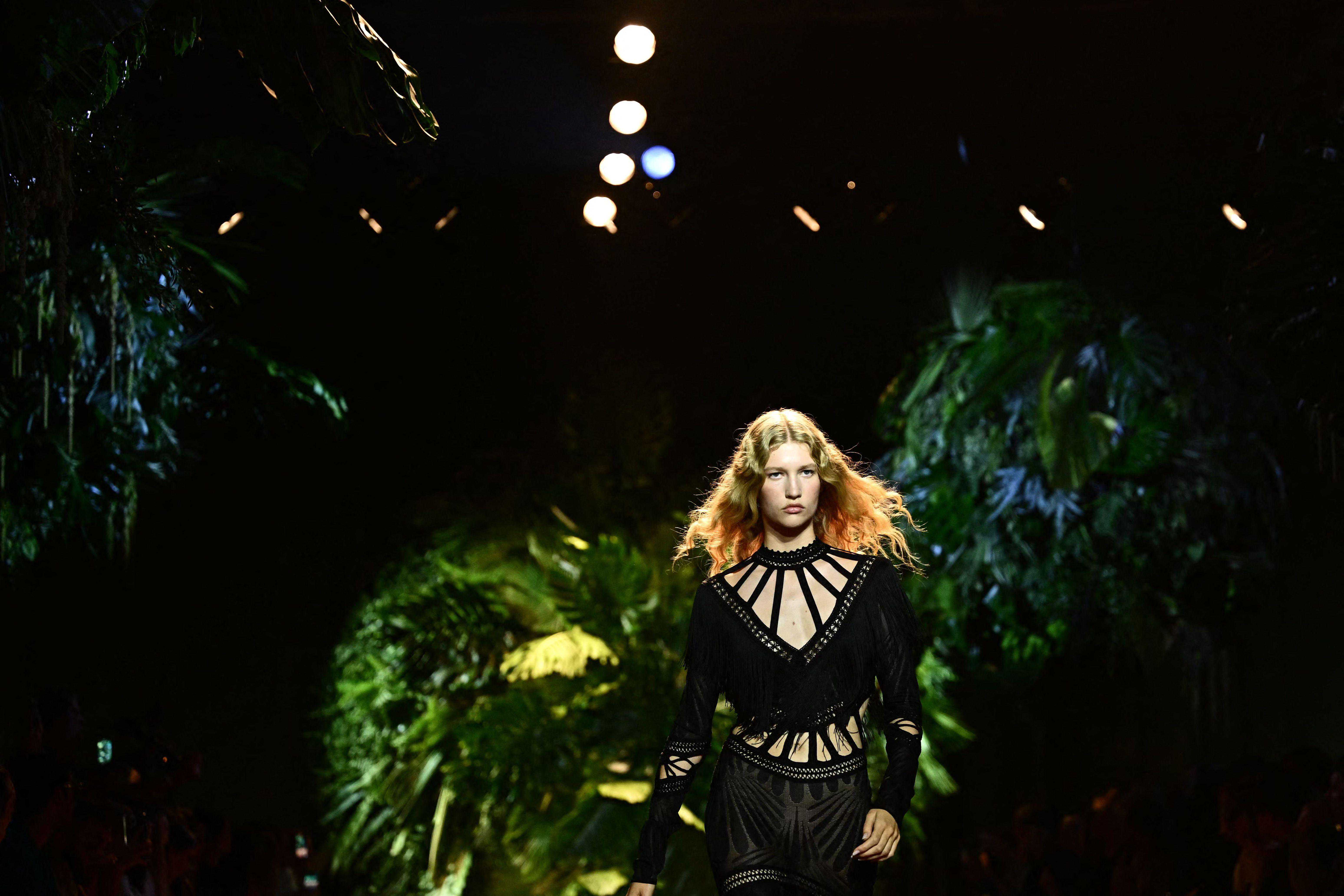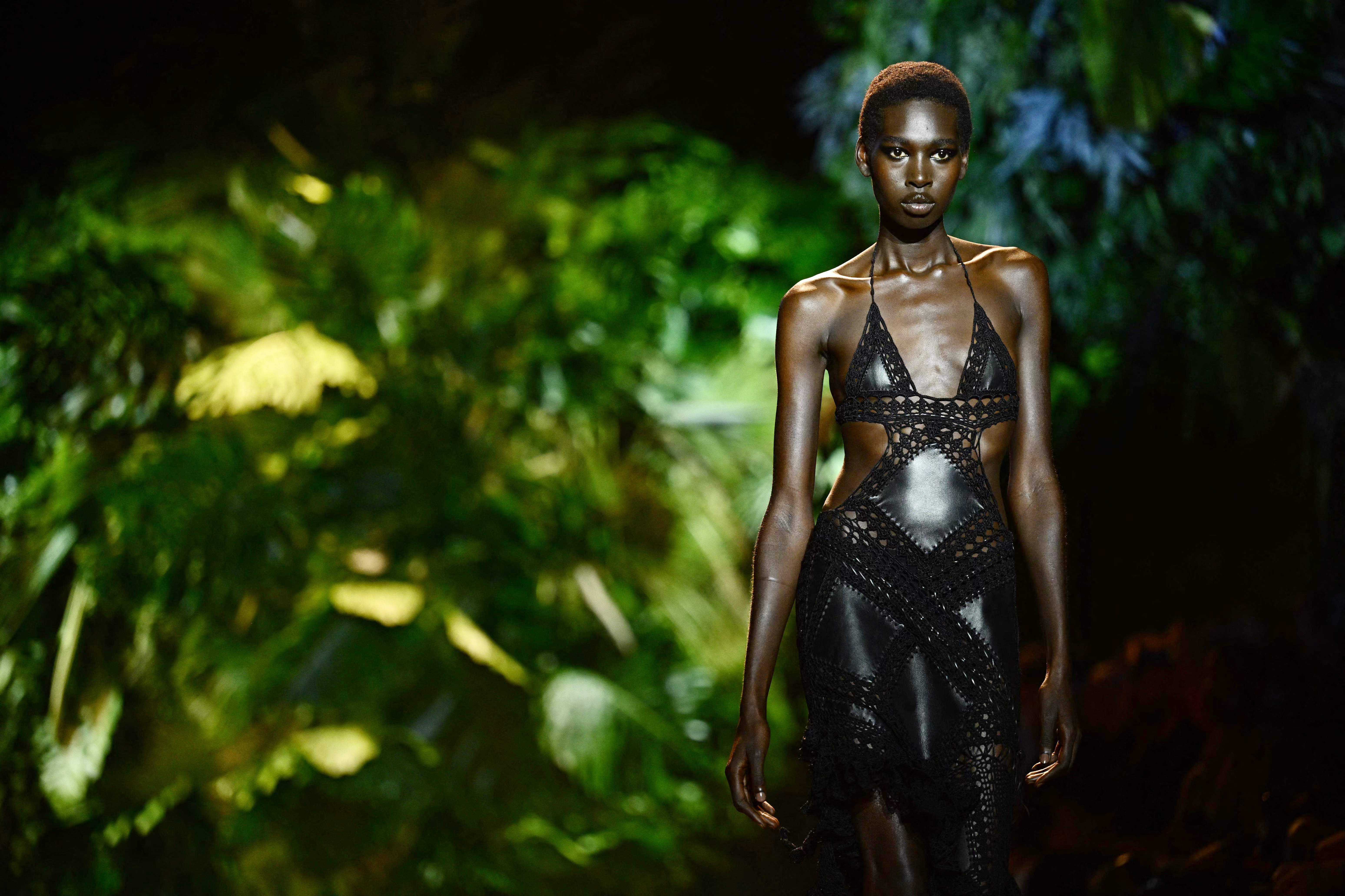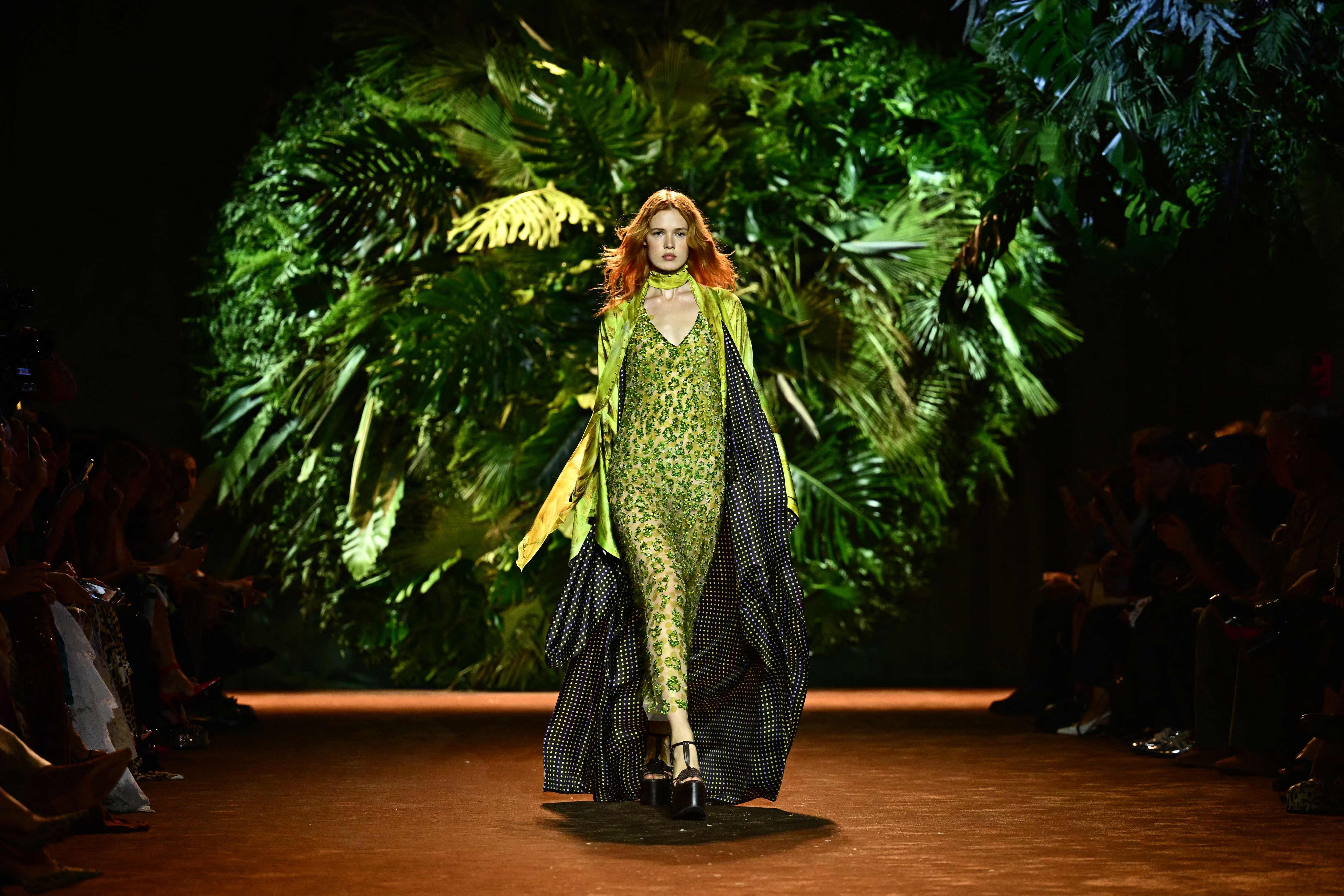9月20日,模特在意大利米兰时装周上展示RobertoCavalli品牌的2024春夏新款服装。新华社/法新