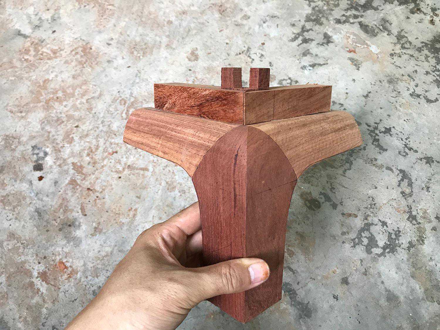 榫头的肩是弧形的,肩的弧度大小和相交圆材的接触面弧度一致。