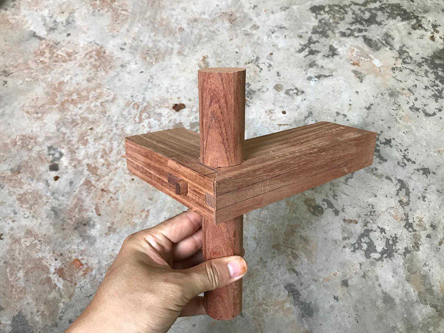 制作烟袋锅榫可以理解为正方形的方材直肩丁字接合,然后倒圆而成。
