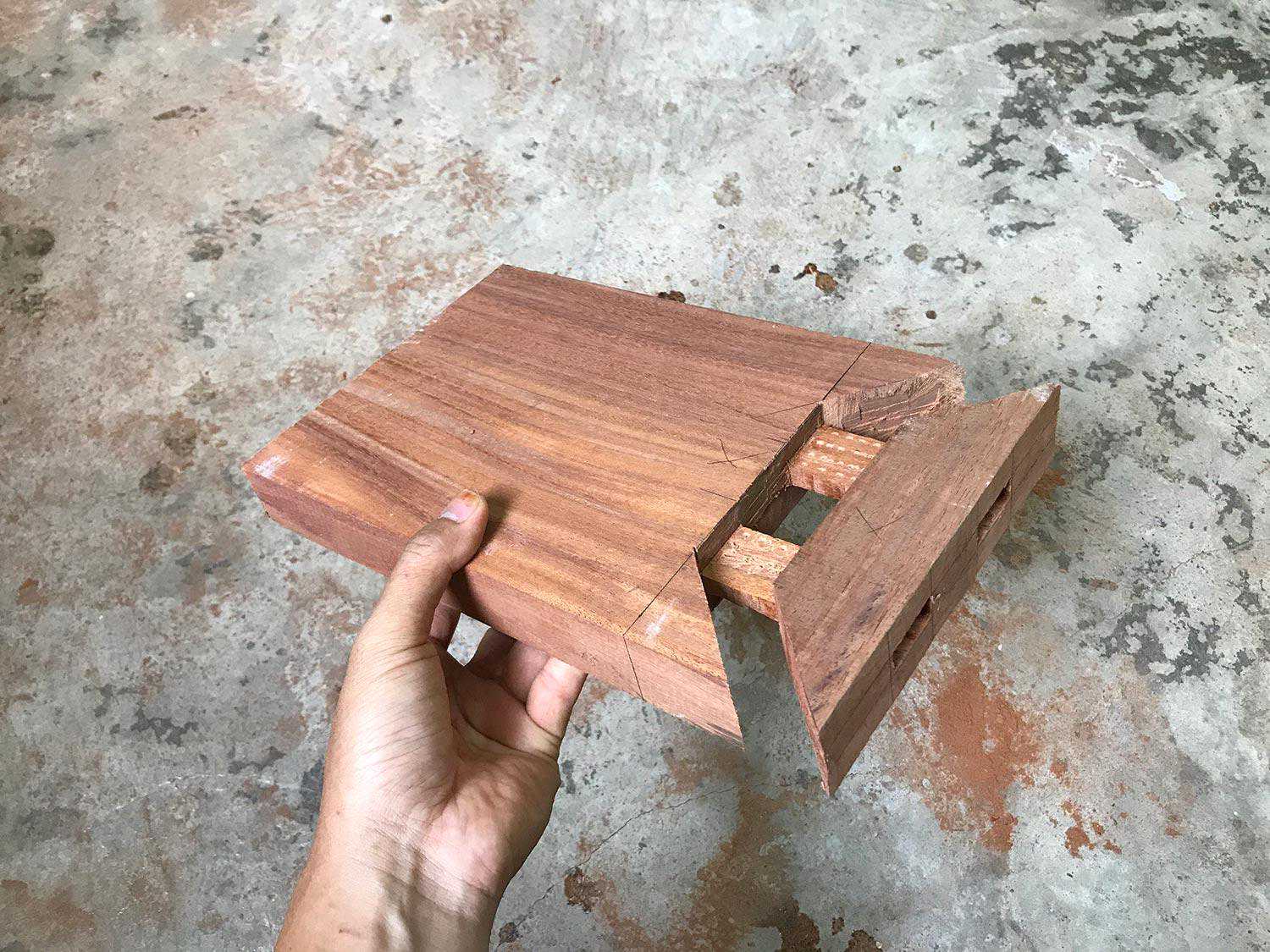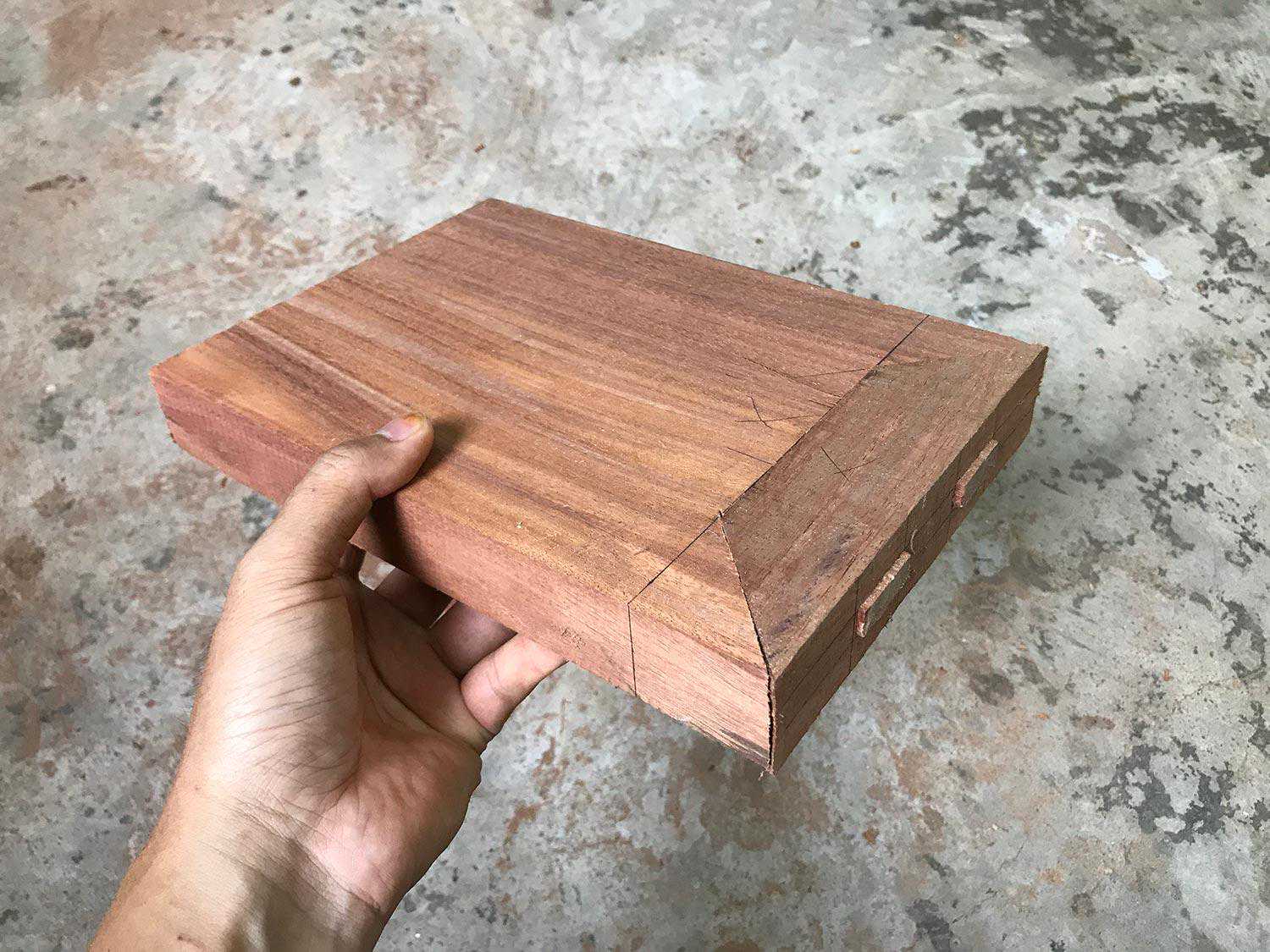 这种方法是平板角接合的最讲究方法,从外表看不到榫头,但不如明燕尾榫牢固。
