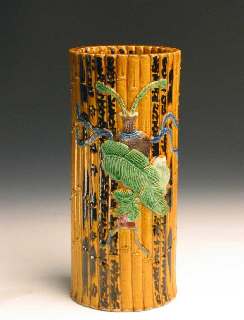 清黄釉雕竹节式帽筒