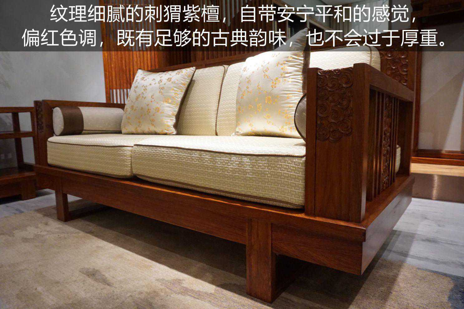 国标红木中紫檀属花梨木类的刺猬紫檀,纹理细腻,跳跃度不大,自带安宁平和的感觉。偏红色调的处理,既有足够的古典韵味,也不会显得过于厚重,对中等客厅产生压迫感。