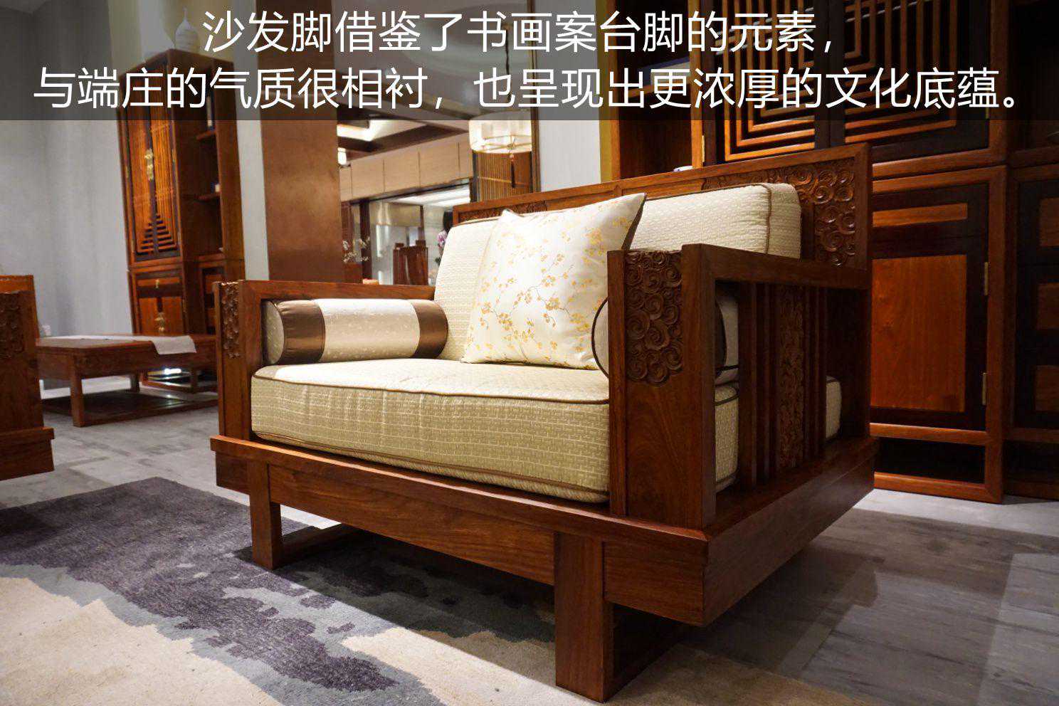 沙发脚借鉴了书画案台脚的元素,与整体端庄的气质很相衬,也呈现出更浓厚的文化底蕴。同时,加粗缩短的改良,让整体更显沉稳。