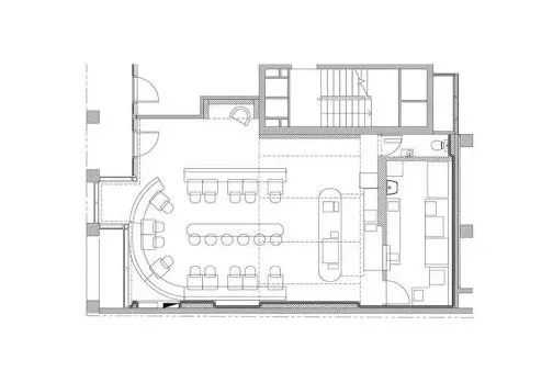 设计团队以更大胆的方法处理设计元素,同时最大限度地优化空间。弧形沙发环绕布置在咖啡厅前部的通高空间中,其中心是共享吧台。隧道式拱门将顾客引向咖啡厅的深处,同时勾勒出尽头的贩售柜台,其背景墙装饰着没有实际功能的狭窄阶梯。