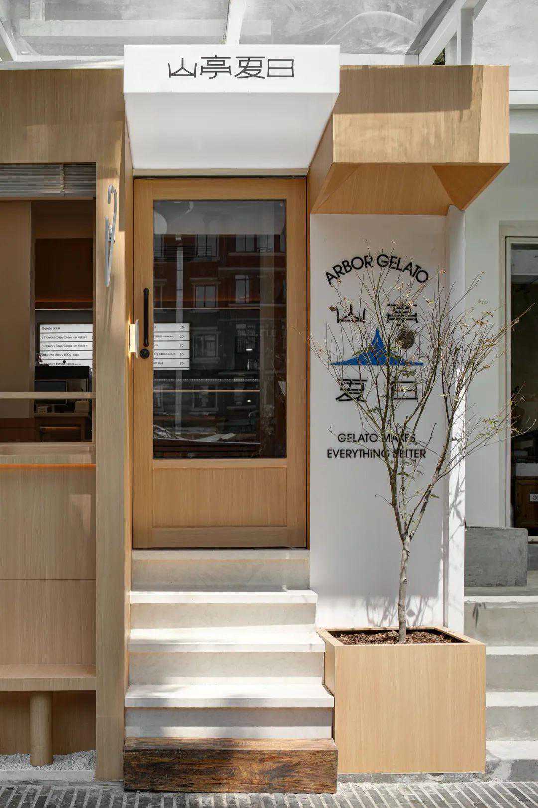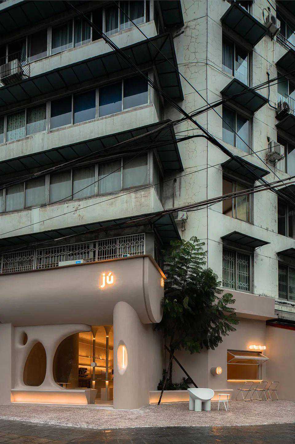设计从色彩进入,用体块构造表达,辅以灯光氛围,最终落地。入口是一面“L”形的粉色墙体,右下角隐约能看到内部露出的白色结构体,白色的门套结构甚至已经突破粉色的包裹,使进入内部空间这个行为更“理所当然”。远处还能透过左边墙面的窗口看到内部咖啡师的制作,顾客未进门就能感受到氛围。门面亮点是一根横跨整个粉墙的霓虹灯管,傍晚以后有很强的视觉冲击。门前还有一个小院子,白水泥从地面长出来,形成台阶、矮墙、花坛、平台。