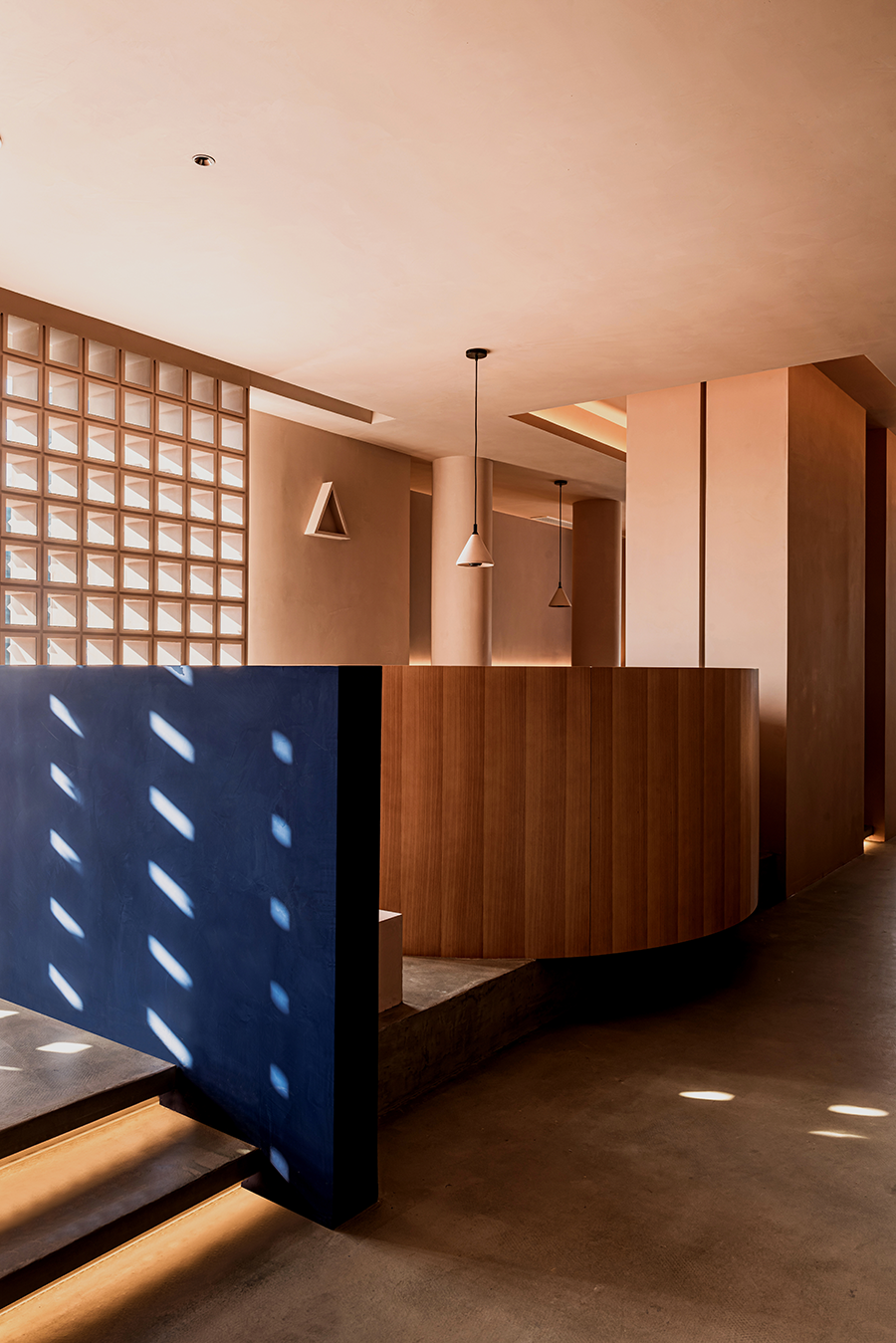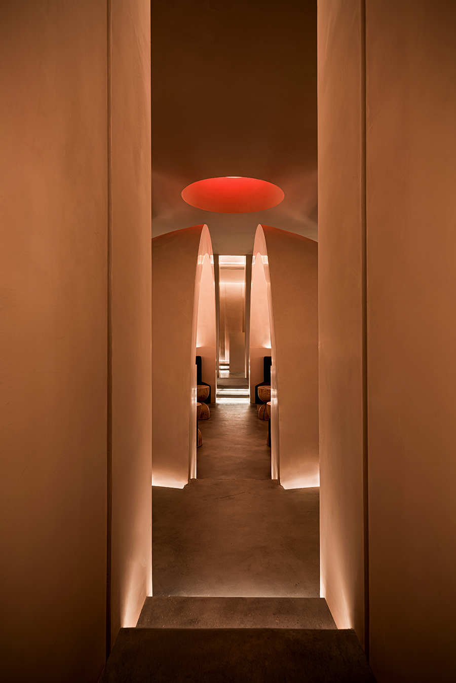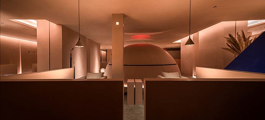 设计师用三角“刺破”天花,所以边界此后去哪,圆被从中割裂,深不见底的红色在蔓延,竟然从眼里渗透到情绪里,这又是什么在作用。