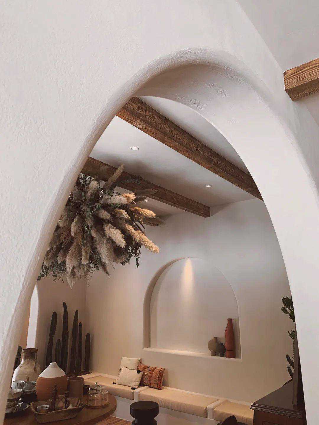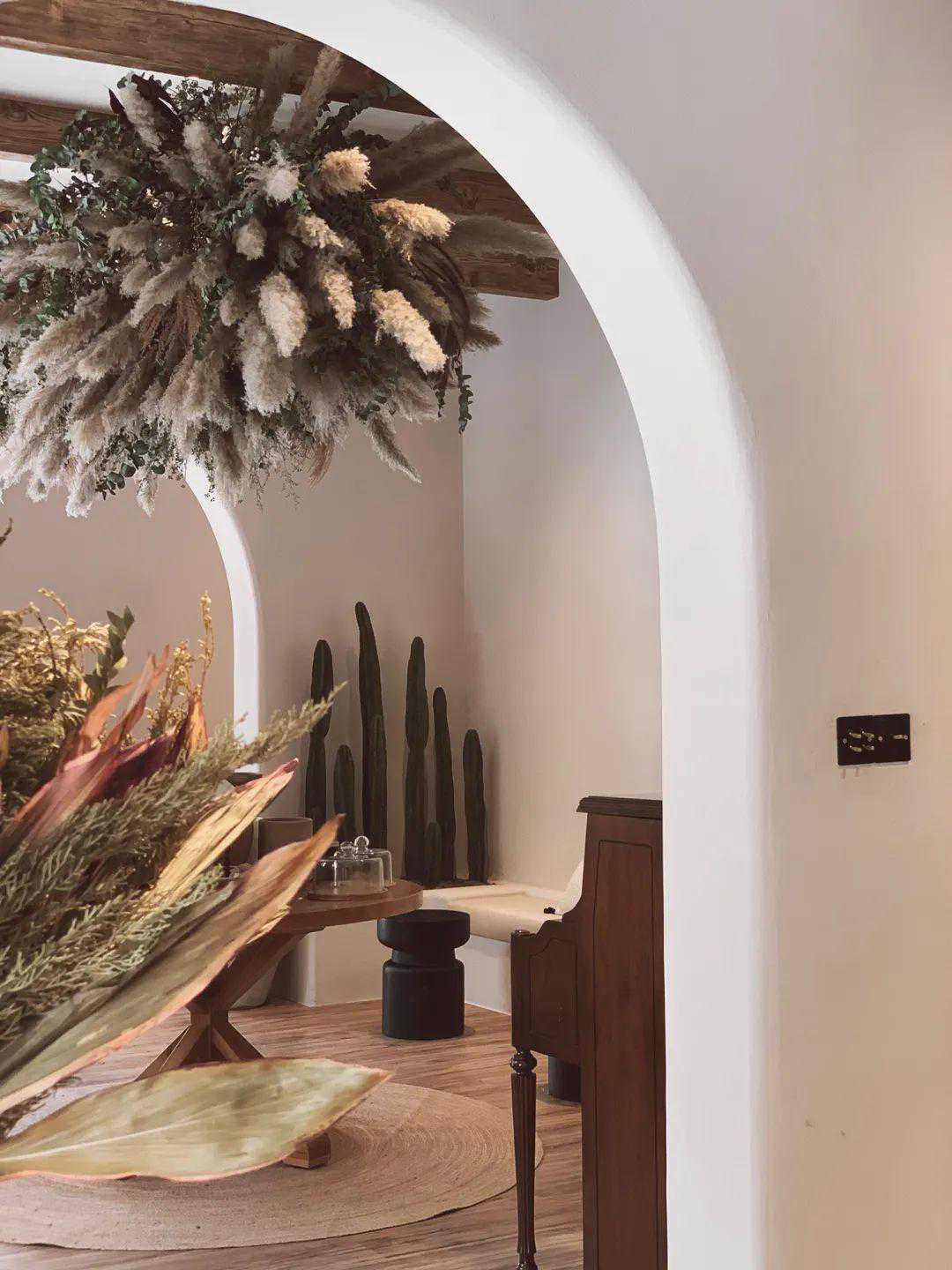 一楼室内空间特别改造了前后两道户型玻璃门,让客人在花园和室内穿梭走动时更多增一些特别的体验,室内分成主厅,次厅及后厨三大块,每个空间均巧妙的用弧形门关做分割,室内墙体选用灰白色粗糙肌理感漆,洞穴结构让所有饰品的呈现显得精致独特,主次厅的天花运用旧船木作横梁点缀,打破原本空间沉闷平淡感,点睛之笔是悬吊在天花上的巨大花艺装置,与下面的复古钢琴和中古旧物形成很好的视觉呼应,座位区除了设计师精心选用的经典藤编瑞克椅,靠墙部分还将户外座位设计特点直接引用到室内,具有趣味性又与户外形成一定的特色关联,整体空间在淡淡的植物草本味道陪衬下体现出浓浓的异域寂静风。